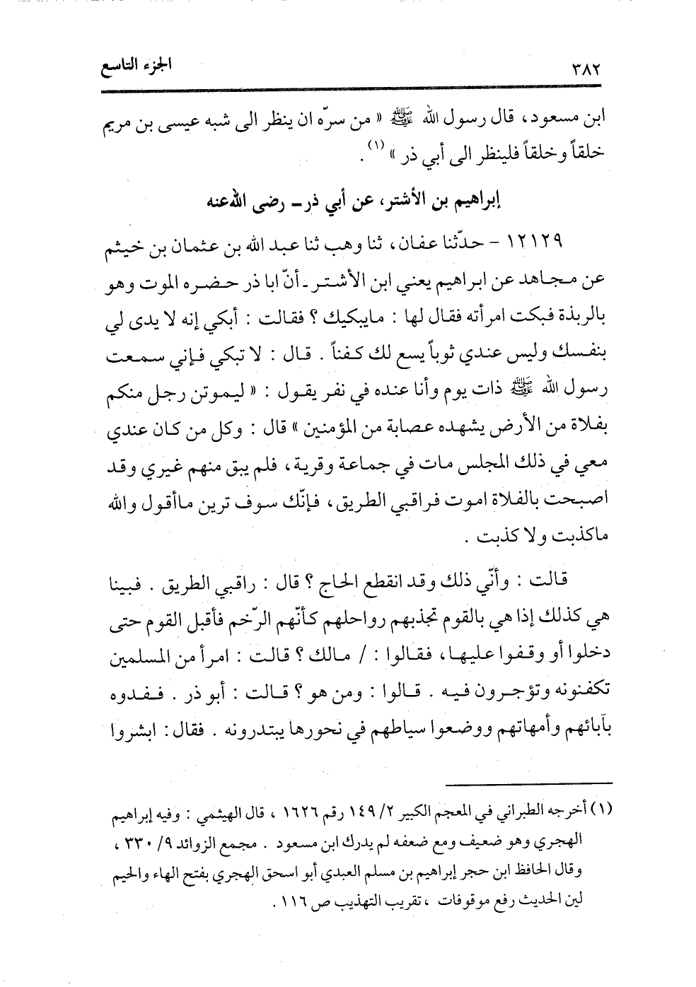 12129 - حدثنا عفان، ثنا وهب ثنا عبد الله بن عثمان بن خيثم عن مجاهد عن إبراهيم يعنى ابن الأشتر ـ أن أبا ذر حضره الموت وهو بالربذة فبكت امرأته فقال لها: ما يبكيك؟ فقال: أبكى إنه لا يدى لى بنفسك وليس عندى ثوبًا يسع لك كفنًا. قال: لا تبكى فإنى سمعت رسول الله - صلى الله عليه وسلم - ذات يوم وأنا عنده فى نفر يقول: «ليموتن رجل منكم بفلاة من الأرض يشهده عصابة من المؤمنين» قال: وكل من كان عندى معى فى ذلك المجلس مات فى جماعة وقرية، فلم يبق منهم غيرى وقد أصبحت بالفلاة أموت فراقبى الطريق، فإنك سوف ترين ما أقول والله ما كذبت ولا كذبت.