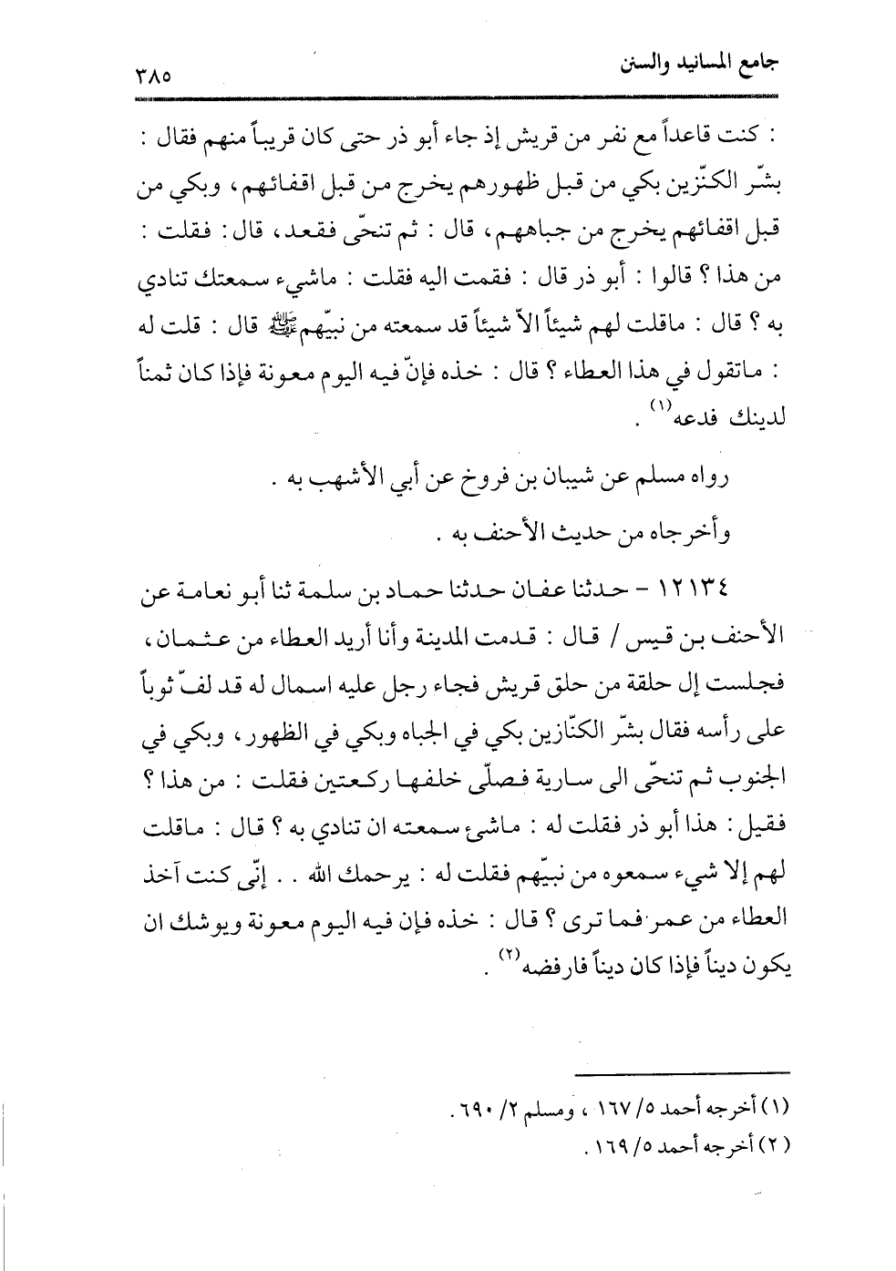 12134 - حدثنا عفان حدثنا حماد بن سلمة ثنا أبو نعامة عن الأحنف بن قيس/ قال: قدمت المدينة وأنا أريد العطاء من عثمان، فجلست إلى حلقة من حلق قريش فجاء رجل عليه أسمال له قد لف ثوبًا على رأسه فقال بشر الكنازين بكى فى الجباه وبكى فى الظهور، وبكى فى الجنوب ثم تنحى إلى سارية فصلى خلفها ركعتين فقلت: من هذا؟ فقيل: هذا أبو ذر فقلت له: ما شىء سمعته أن تنادى به؟ قال: ما قلت لهم إلا شىء سمعوه من نبيهم فقلت له: يرحمك الله.. إنى كنت آخذ العطاء من عمر فما ترى؟ قال: خذه فإن فيه اليوم معونة ويوشك أن يكون دينًا فإذا كان دينًا فأرفضه (¬1) .