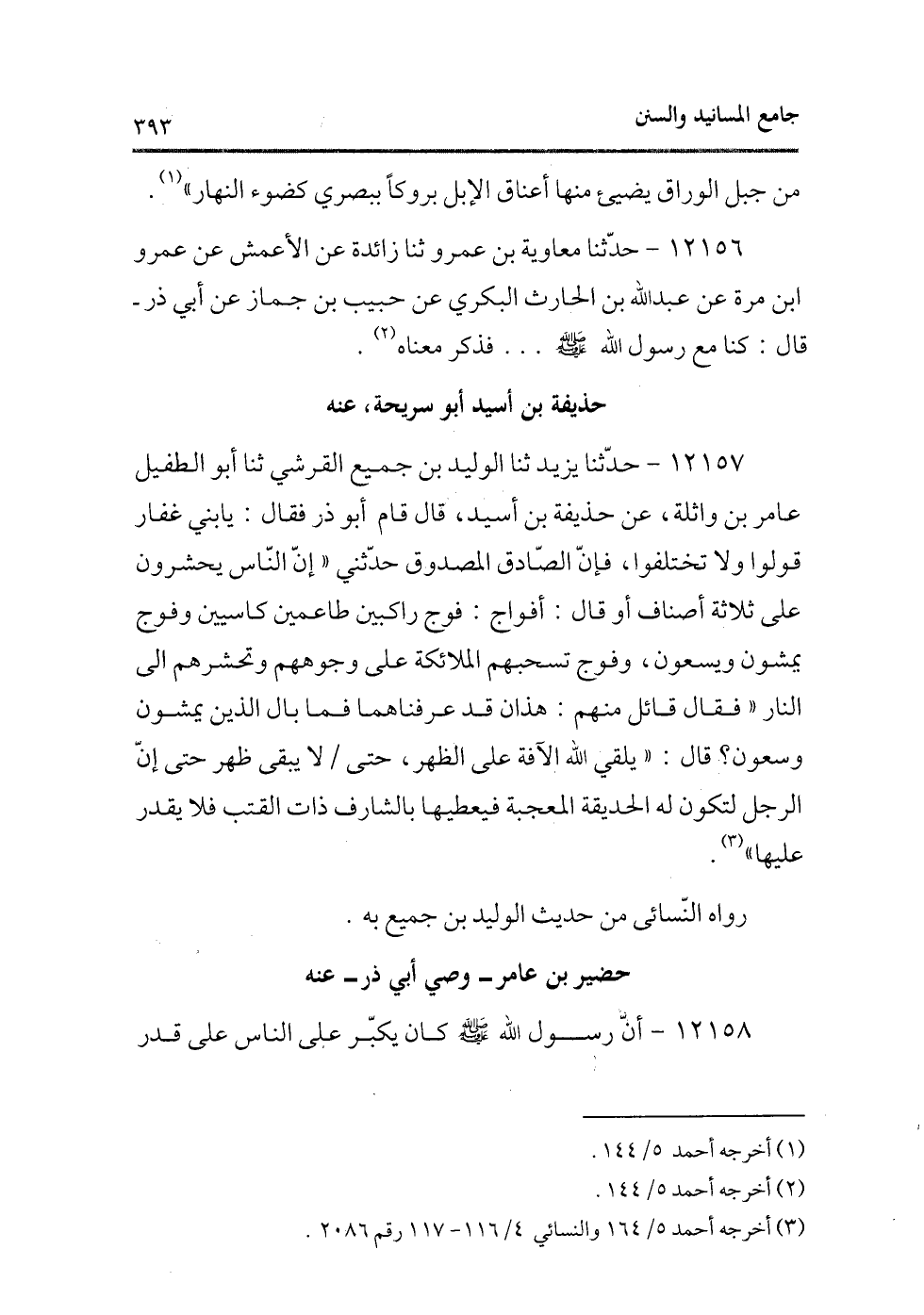 12157 - حدثنا يزيد ثنا الوليد بن جميع القرشى ثنا أبو الطفيل عامر بن واثلة، عن حذيفة بن أسيد، قال قام أبو ذر فقال: يا بنى غفار قولوا ولا تختلفوا، فإن الصادق المصدوق حدثنى «إن الناس يحشرون على ثلاثة أصناف أو قال: أفواج: فوج راكبين طاعمين كاسيين وفوج يمشون ويسعون، وفوج تسحبهم الملائكة على وجوههم وتحشرهم إلى النار» فقال قائل منهم: هذان قد عرفناهما فما بال الذين يمشون وسعون؟ قال: «يلقى الله الآفة على الظهر، حتى/ لا يبقى ظهر حتى إن الرجل لتكون له الحديقة المعجبة فيعطيها بالشارف ذات القتب فلا يقدر عليها» (¬2) .