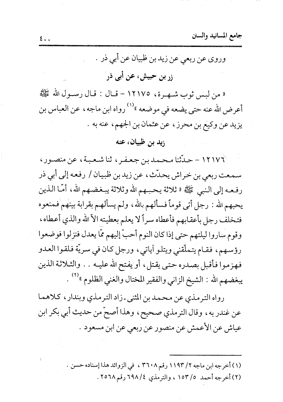 12176 - حدثنا محمد بن جعفر، ثنا شعبة، عن منصور، سمعت ربعى بن خراش يحدث، عن زيد بن ظبيان/ رفعه إلى أبى ذر رفعه إلى النبى - صلى الله عليه وسلم - «ثلاثة يحبهم الله وثلاثة يبغضهم الله، أما الذين بحبهم الله: رجل أتى قومًا فسألهم بالله، ولم يسألهم بقرابة بينهم فمنعوه فتخلف رجل بأعقابهم فأعطاه سرًا لا يعلم بعطيته إلا الله والذى أعطاه، وقوم ساروا ليلتهم حتى إذا كان النوم أحب إليهم مما يعدل فنزلوا فوضعوا رؤسهم، فقام يتملقنى ويتلو آياتى، ورجل كان فى سرية فلقوا العدو فهزموا فأقبل بصدره حتى يقتل، أو يفتح الله عليه.. والثلاثة الذين يبغضهم الله: الشيخ الزانى والفقير المختال والغنى الظلوم» (¬2) .
