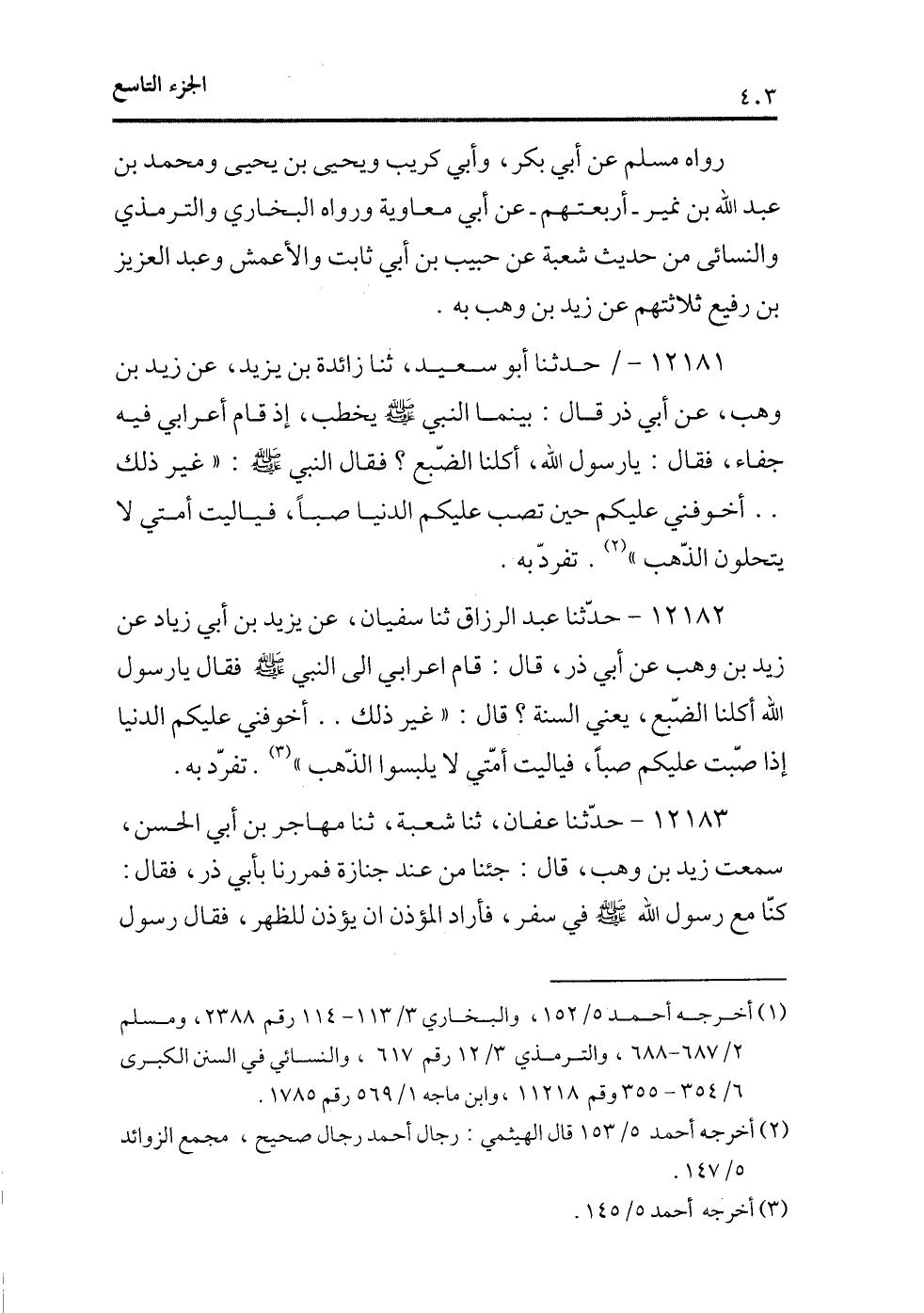 12181 - /حدثنا أبو سعيد، ثنا زائدة بن يزيد، عن زيد بن وهب، عن أبى ذر قال: بينما النبى - صلى الله عليه وسلم - يخطب، إذ قام أعرابى فيه جفاء، فقال: يا رسول الله، أكلنا الضبع؟ فقال النبى - صلى الله عليه وسلم -: «غير ذلك.. أخوفنى عليكم حين تصب عليكم الدنيا صبًا، فياليت أمتى لا يتحلون الذهب» (¬1) . تفرد به.