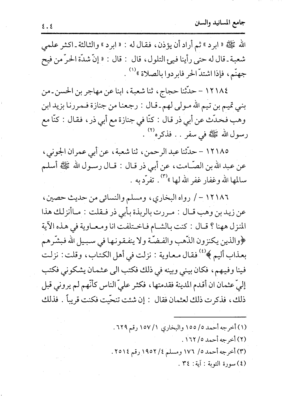 12184 - حدثنا حجاج، ثنا شعبة، ابنا عن مهاجر بن الحسن ـ من بنى تميم بن تيم الله مولى لهم ـ قال: رجعنا من جنازة فمررنا بزيد ابن وهب فحدث عن أبى ذر قال: كنا فى جنازة مع أبى ذر، فقال: كنا مع رسول الله - صلى الله عليه وسلم - فى سفر.. فذكره (¬1) .