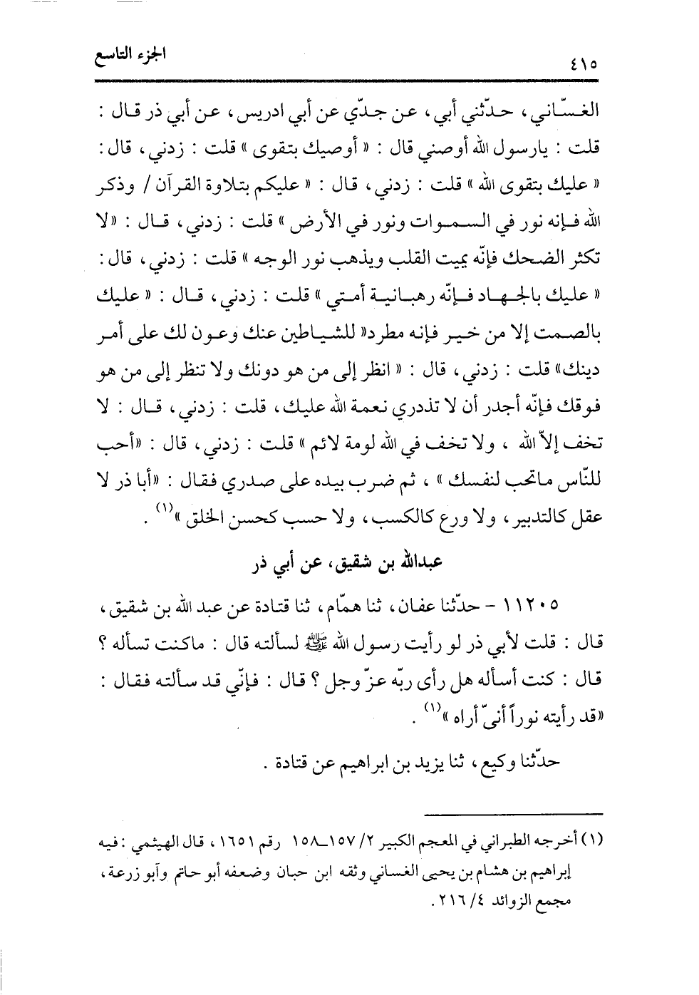 الغسانى، حدثنى أبى، عن جدى عن أبى إدريس، عن أبى ذر قال: قلت: يا رسول الله أوصنى قال: «أوصيك بتقوى» قلت: زدنى، قال: «عليك بتقوى الله» قلت: زدنى، قال: «عليكم بتلاوة القرآن/ وذكر الله فإن نور فى السموات ونور فى الأرض» قلت: زدنى، قال: «لا تكثر الضحك فإنه يميت القلب ويذهب نور الوجه» قلت: زدنى، قال: «عليك بالجهاد فإنه رهبانية أمتى» قلت: زدنى، قال: «عليك بالصمت إلا من خير فإنه مطرد للشياطين عنك وعون لك على أمر دينك» قلت: زدنى، قال: «انظر إلى من هو دونك ولا تنظر إلى من هو فوقك فإنه أجدر أن لا تزدرى نعمة الله عليك» ، قلت: زدنى، قال: «لا تخف إلا الله، ولا تخف فى الله لومة لائم» قلت: زدنى، قال: «أحب للناس ما تحب لنفسك» ، ثم ضرب بيده على صدرى فقال: «أبا ذر لا عقل كالتدبير، ولا ورع كالكسب، ولا حسب كحسن الخلق» (¬1) .