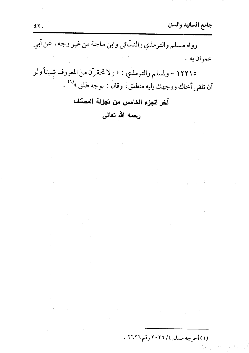 12215 - ولمسلم والترمذى: «ولا تحقرن من المعروف شيئًا ولو أن تلقى أخاك ووجهك إليه منطلق، وقال: بوجه طلق» (¬1) .