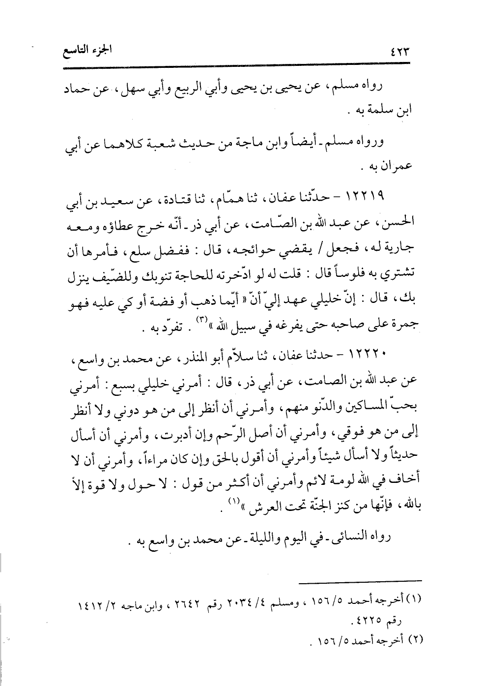 12220 - حدثنا عفان، ثنا سلام أبو المنذر، عن محمد بن واسع، عن عبد الله بن الصامت، عن أبى ذر، قال: أمرنى خليلى بسبع: «أمرنى بحب المساكين والدنو منهم، وأمرنى أن أنظر إلى من هو دونى ولا أنظر إلى من هو فوقى، وأمرنى أن أصل الرحم وإن أدبرت، وأمرنى أن أسأل حديثًا ولا أسأل شيئًا وأمرنى أن أقول بالحق وإن كان مراءًا، وأمرنى أن لا أخاف فى الله لومة لائم وأمرنى أن أكثر من قول: لا حول ولا قوة إلا بالله، فإنها من كنز الجنة تحت العرش» (¬2) .