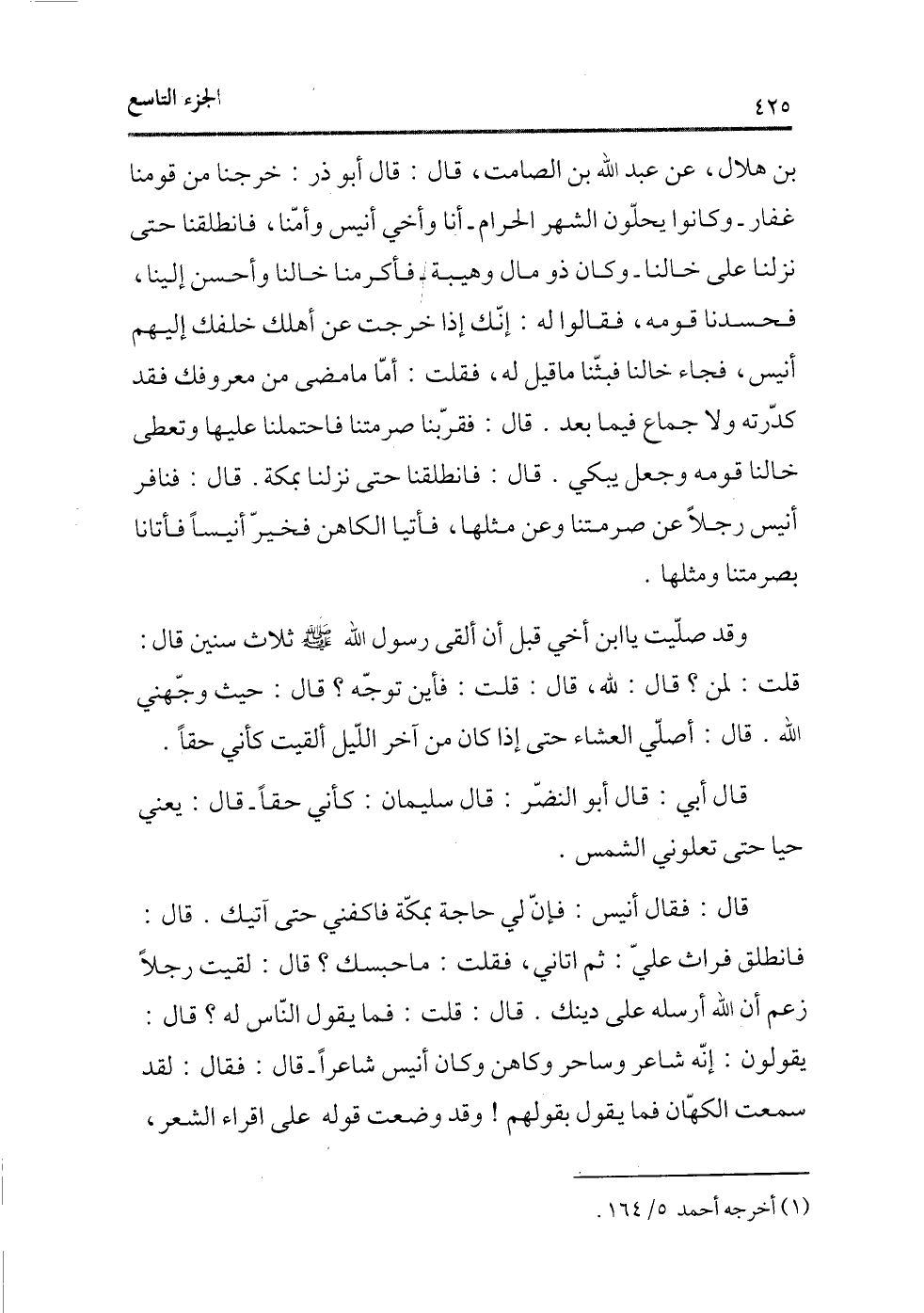 بن هلال، عن عبد الله بن الصامت، قال: قال أبو ذر: خرجنا من قومنا غفار ـ وكانوا يحلون الشهر الحرام ـ أنا وأخى أنيس وأمنا، فانطلقنا حتى نزلنا على خالنا ـ وكان ذو مال وهيبة ـ فأكرمنا خالنا وأحسن إلينا، فحسدنا قومه، فقالوا له: إنك إذا خرجت عن أهلك خلفك إليهم أنيس، فجاء خالنا فبثنا ما قيل له، فقلت: أما ما مضى من معروفك فقد كدرته ولا جماع فيما بعد. قال: فقربنا صرمتنا فاحتملنا عليها وتعطى خالنا قومه وجعل يبكلى. قال: فانطلقنا حتى نزلنا بمكة. قال: فنافر أنيس رجلاً عن صرمتنا وعن مثلها، فأتيا الكاهن فخير أنيسًا فأتانا بصرمتنا ومثلها.