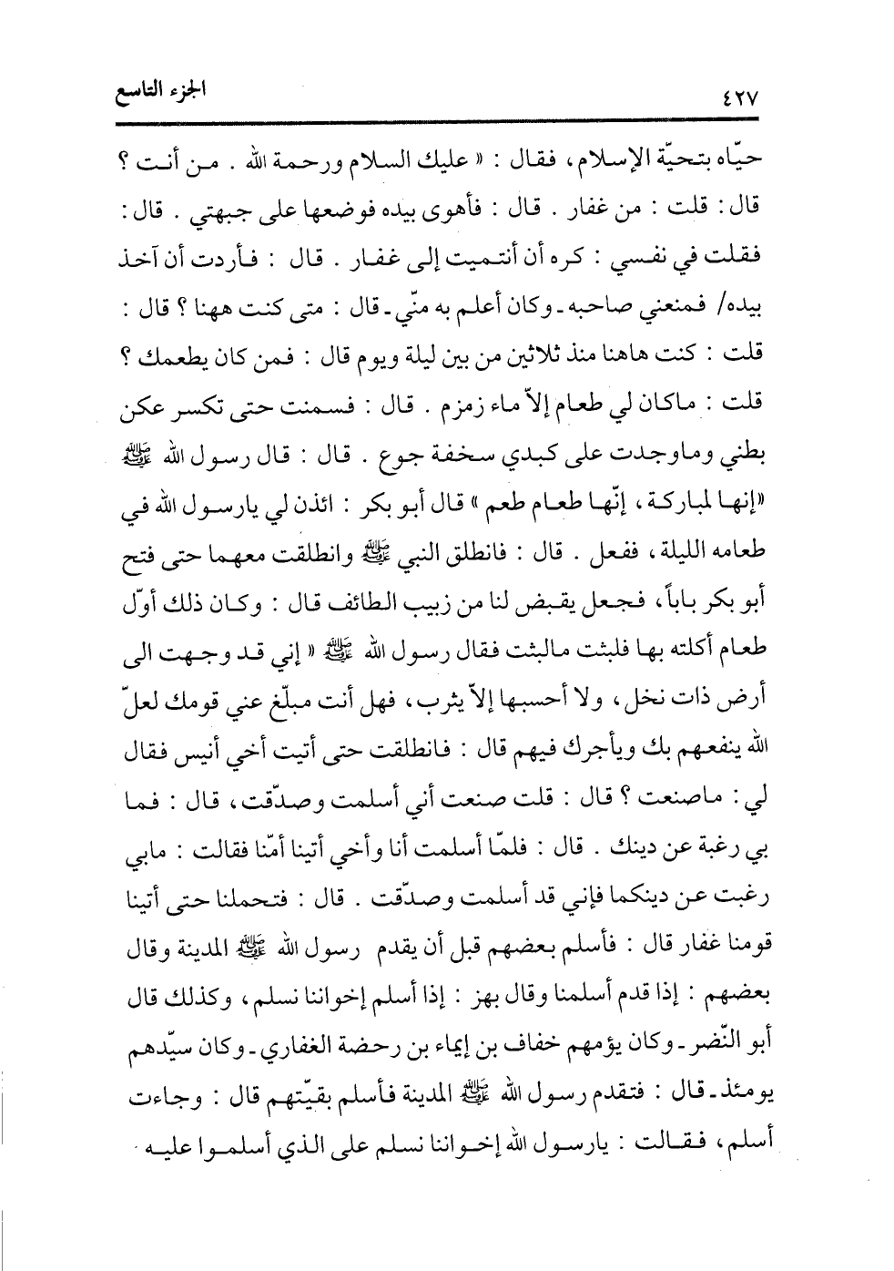 حياه بتحية الإسلام، فقال: «عليك السلام ورحمة الله. من أنت؟ قال: قلت: من غفار. قال: فأهوى بيده فوضعها على جبهتى. قال: فقلت فى نفسى: كره أن أنتميت إلى غفار. قال: فأردت أن آخذ بيده/ فمنعنى صاحبه ـ وكان أعلم به منى ـ قال: متى كنت ههنا؟ قال: قلت: كنت هاهنا منذ ثلاثين من بين ليلة ويوم قال: فمن كان يطعمك؟ قلت: ما كان لى طعام إلا ماء زمزم. قال: فسمنت حتى تكسر عكن بطنى وما وجدت على كبدى سخفة جوع. قال: قال رسول الله - صلى الله عليه وسلم - «إنها لمباركة، إنها طعام طعم» قال أبو بكر: ائذن لى يا رسول الله فى طعامه الليلة، ففعل. قال: فانطلق النبى - صلى الله عليه وسلم - وانطلقت معهما حتى فتح أبو بكر بابًا، فجعل يقبض لنا من زبيب الطائف قال: وكان ذلك أول طعام أكلته بها فلبثت ما لبثت فقال رسول الله - صلى الله عليه وسلم - «إنى قد وجهت إلى أرض ذات نخل، ولا أحسبها إلا يثرب، فهل أنت مبلغ عنى قومك لعل الله ينفعهم بك ويأجرك فيهم قال: فانطلقت حتى أتيت أخى أنيس فقال لى: ما صنعت؟ قال: قلت صنعت أنى أسلمت وصدقت، قال: فما بى رغبة عن دينك. قال: فلما أسلمت أنا وأخى أتينا أمنا فقالت: ما بى رغبت عن دينكما فإنى قد أسلمت وصدقت.
