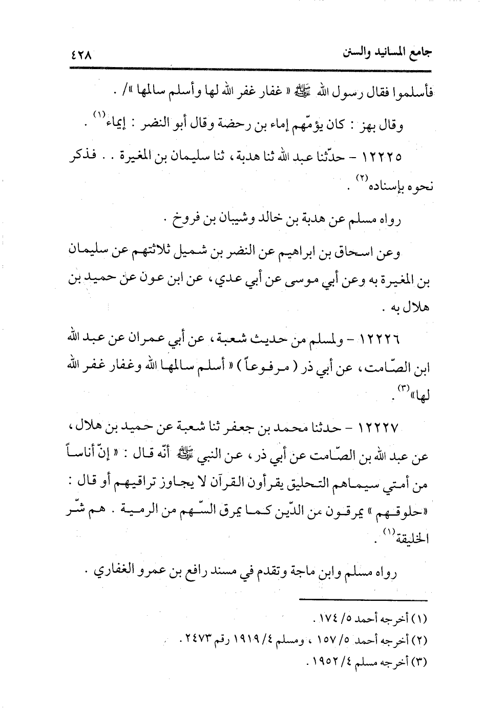 12226 - ولمسلم من حديث شعبة، عن أبى عمران عن عبد الله بن الصامت عن أبى ذر؟ (مرفوعًا) «أسلم سالمها الله وغفار غفر الله لها» (¬2) .