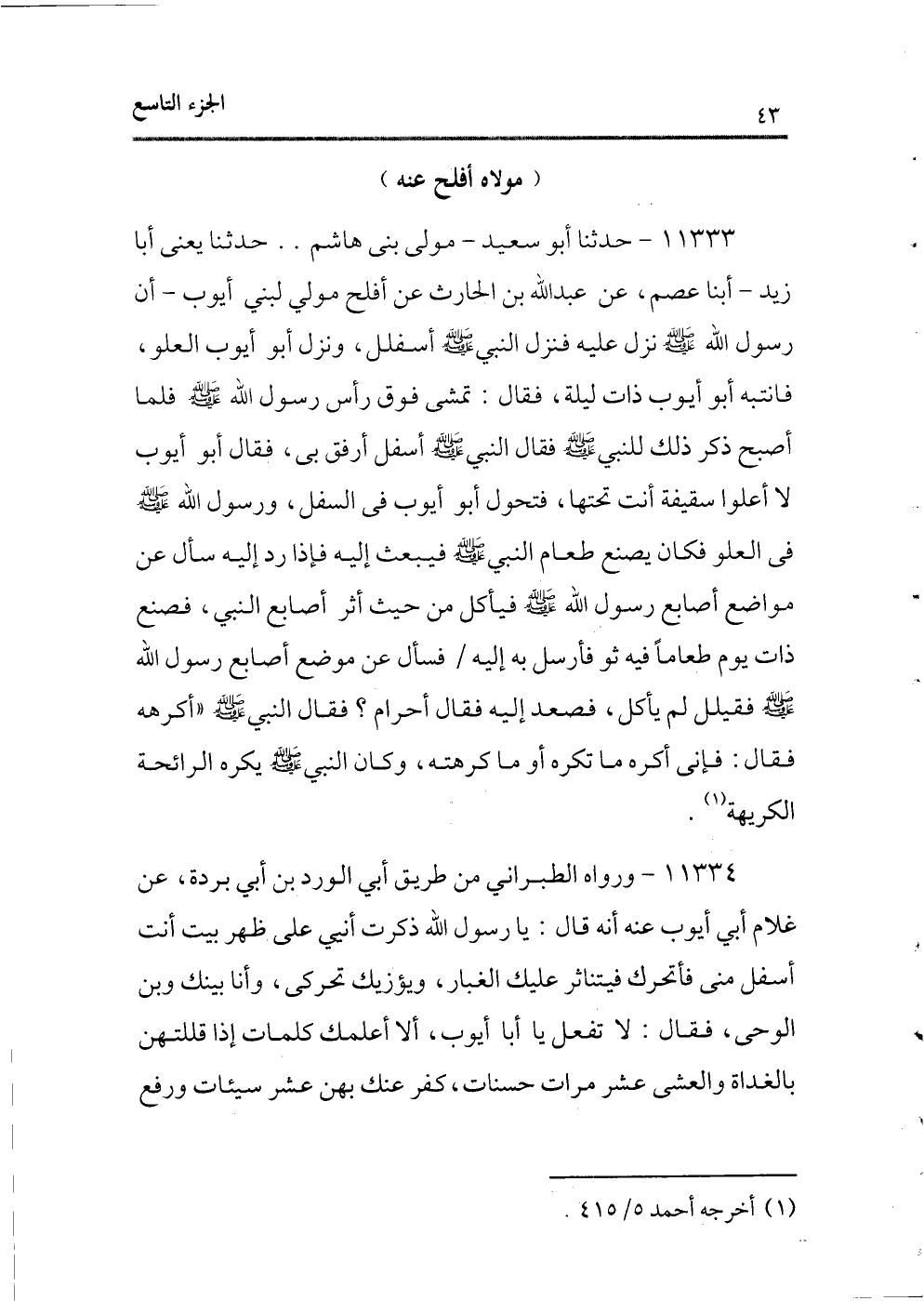 11333 - حدثنا أبو سعيد ـ مولى بنى هاشم.. حدثنا يعنى أبا زيد ـ أبنا عصم، عن عبد الله بن الحارث عن أفلح مولى لبنى أيوب ـ أن رسول الله - صلى الله عليه وسلم - نزل عليه فنزل النبى - صلى الله عليه وسلم - أسفل، ونزل أبو أيوب العلو، فانتبه أبو أيوب ذات ليلة، فقال: تمشى فوق رأس رسول الله - صلى الله عليه وسلم - فلما أصبح ذكر ذلك للنبى - صلى الله عليه وسلم - فقال النبى - صلى الله عليه وسلم - أسفل أرفق بى، فقال أبو أيوب لا أعلوا سقيفة أنت تحتها، فتحول أبو أيوب فى السفل، ورسول الله - صلى الله عليه وسلم - فى العلو فكان يصنع طعام النبى - صلى الله عليه وسلم - فيبعث إليه فإذا رد إليه سأل عن مواضع أصابع رسول الله - صلى الله عليه وسلم - فيأكل من حيث أثر أصابع النبى، فصنع ذات يوم طعامًا فيه ثوم فأرسل به إليه/ فسأل عن موضع أصابع رسول الله - صلى الله عليه وسلم - فقيلل لم يأكل، فصعد إليه فقال أحرام؟ فقال النبى - صلى الله عليه وسلم - «أكرهه فقال: فإنى أكره ما تكره أو ما كرهته، وكان النبى - صلى الله عليه وسلم - يكره الرائحة الكريهة (¬1) .