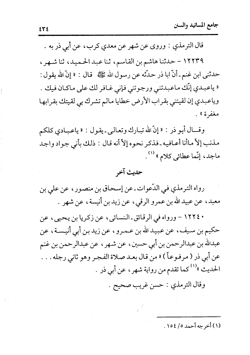 12239 - حدثنا هاشم بن القاسم، ثنا عبد الحميد، ثنا شهر، حدثنى ابن غنم ـ أن أبا ذر حدثه عن رسول الله - صلى الله عليه وسلم - قال: إن الله يقول: «يا عبدى إنك ما عبدتنى ورجوتنى فإنى غافر لك على ما كان فيك. ويا عبدى إن لقيتنى بقراب الأرض خطايا ما لم تشرك بى لقيتك بقرابها مغفرة» .