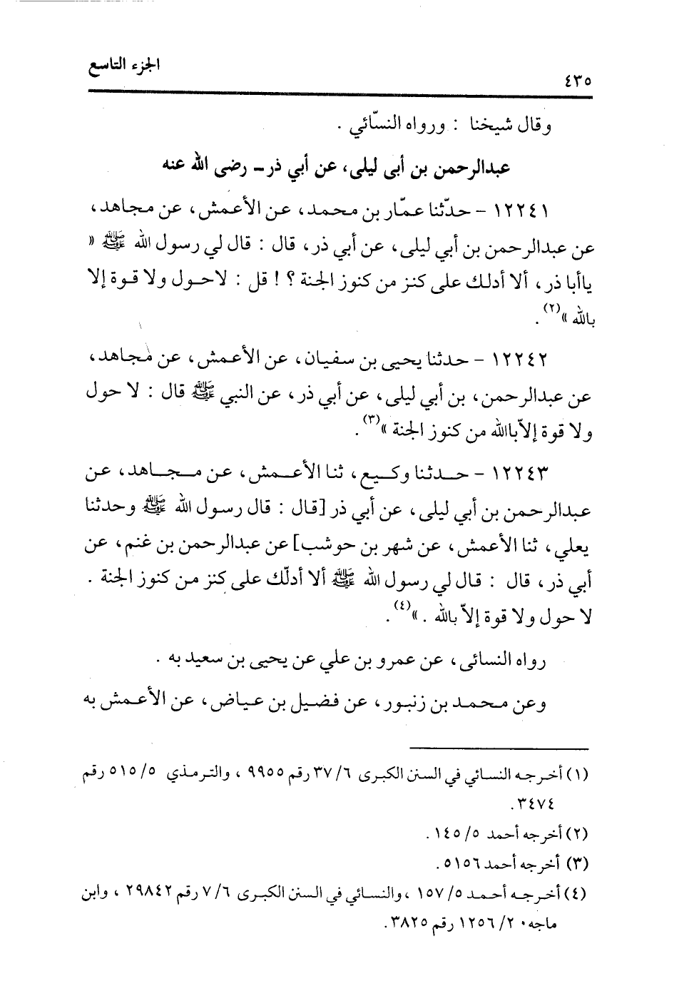 12242 - حدثنا يحيى بن سفيان، عن الأعمش، عن مجاهد، عن عبد الرحمن، بن أبى ليلى، عن أبى ذر، عن النبى - صلى الله عليه وسلم - قال: «لا حول ولا قوة إلا بالله من كنوز الجنة» (¬2) .