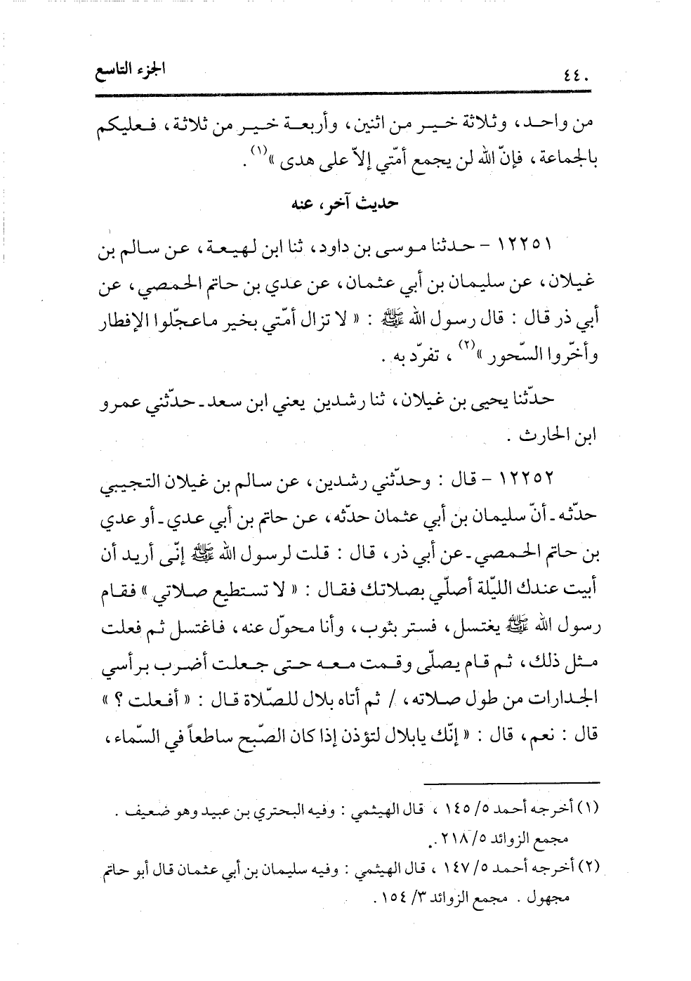 12253 - حدثنا موسى بن داود، ثنا ابن لهيعة، عن سالم بن غيلان، عن سلميان بن أبى عثمان، عن عدى بن حاتم الحمصى، عن أبى ذر ـ أن النبى - صلى الله عليه وسلم - قال لبلال: «أنت يا بلال تؤذن إذا كان الصبح ساطعًا فى السماء،