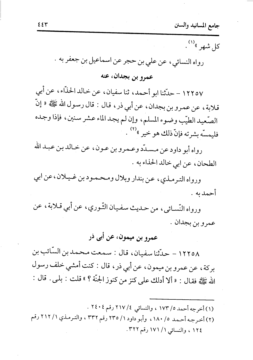 12257 - حدثنا أبو أحمد، ثنا سفيان، عن خالد الحذاء، عن أبى قلابة، عن عمرو بن بجدان، عن أبى ذر، قال: قال رسول الله - صلى الله عليه وسلم - «إن الصعيد الطيب وضوء المسلم، وإن لم يجد الماء عشر سنين، فإذا وجده فليمسه بشرته فإن ذلك هو خير» (¬1) .