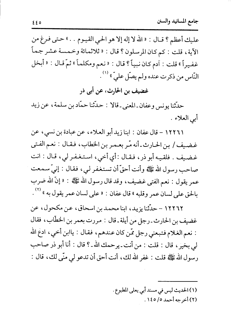 12262 - حدثنا يزيد، ابنا محمد بن إسحاق، عن مكحول، عن غضيف ابن الحارث ـ رجل من أيلة ـ قال: مررت بعمر بن الخطاب، فقال: نعم الغلام فتبعنى رجل ممن كان عندهم، فقال: يا ابن أخى، أدع الله لى بخير، قال: قلت: من أنت ـ يرحمك الله ـ؟ قال: أنا أبو ذر صاحب رسول الله - صلى الله عليه وسلم - قلت: غفر الله لك، أنت أحق أن تدعو لى منى لك، قال: