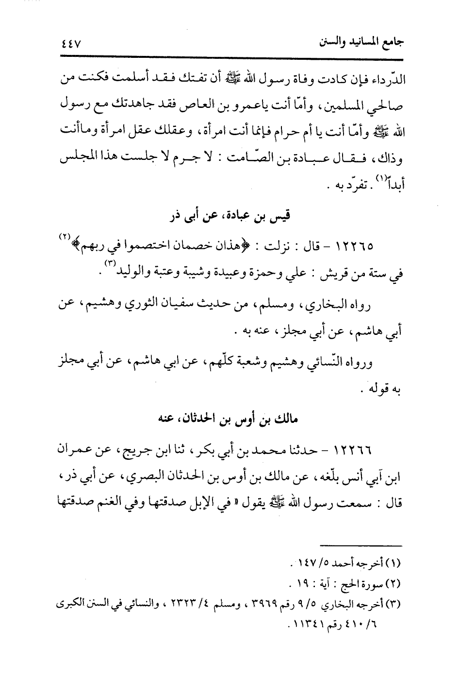 12266 - حدثنا محمد بن أبى بكر، ثنا ابن جريح، عن عمران بن أبى أنس بلغه، عن مالك بن أوس بن الحدثان البصرى، عن أبى ذر، قال: سمعت رسول الله - صلى الله عليه وسلم - يقول «فى الإبل صدقتها وفى الغنم صدقتها