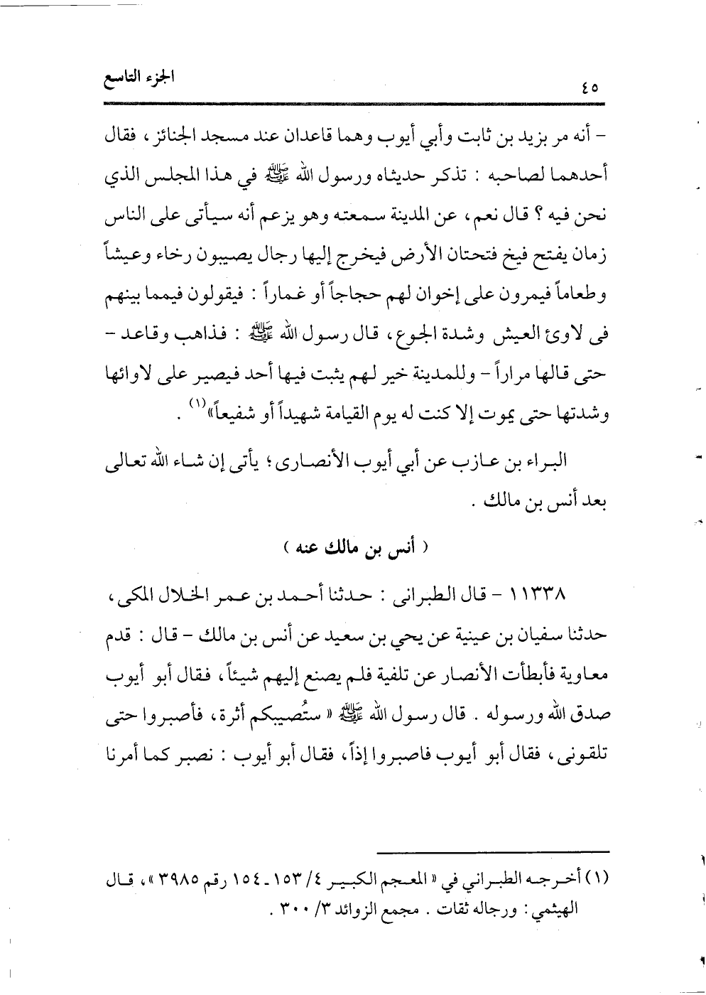 11338 - قال الطبرانى: حدثنا أحمد بن عمر الخلال المكى، حدثنا سفيان بن عيينة عن يحيى بن سعيد عن أنس بن مالك ـ قال: قدم معاوية فأبطأت الأنصار عن تلفية فلم يصنع إليهم شيئًا، فقال أبو أيوب صدق الله ورسوله. قال رسول الله - صلى الله عليه وسلم - «ستُصيبكم أثرة، فأصبروا حتى تلقونى، فقال أبو أيوب فاصبروا إذًا، فقال أبو أيوب: نصبر كما أمرنا