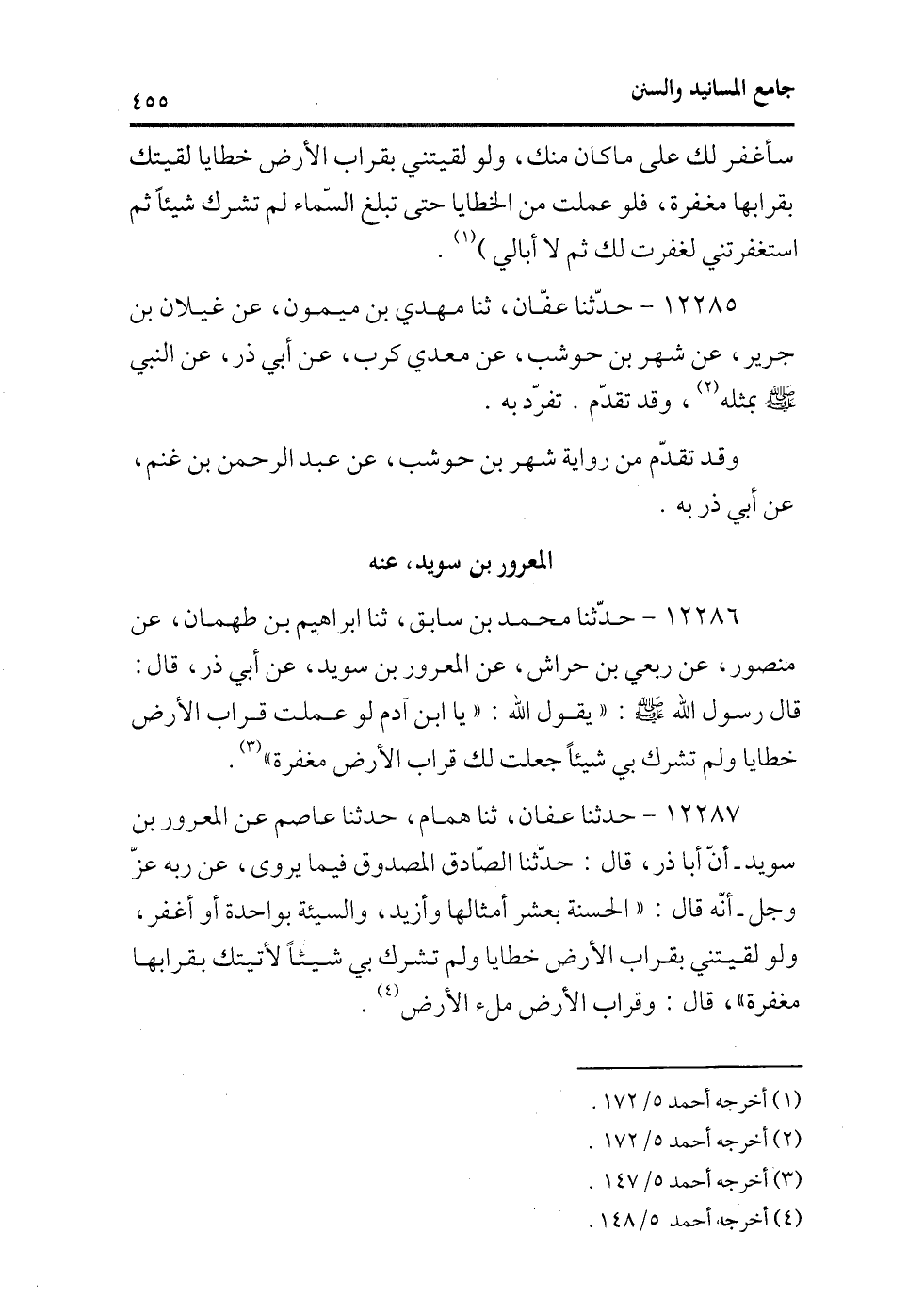 12286 - حدثنا محمد بن سابق، ثنا إبراهيم بن طهمان، عن منصور، عن ربعى بن حراش، عن المعرور بن سويد، عن أبى ذر، قال: قال رسول الله - صلى الله عليه وسلم -: يقول الله: «يا ابن آدم لو عملت قراب الأرض خطايا ولم تشرك بى شيئًا جعلت لك قراب الأرض مغفرة» (¬2) .