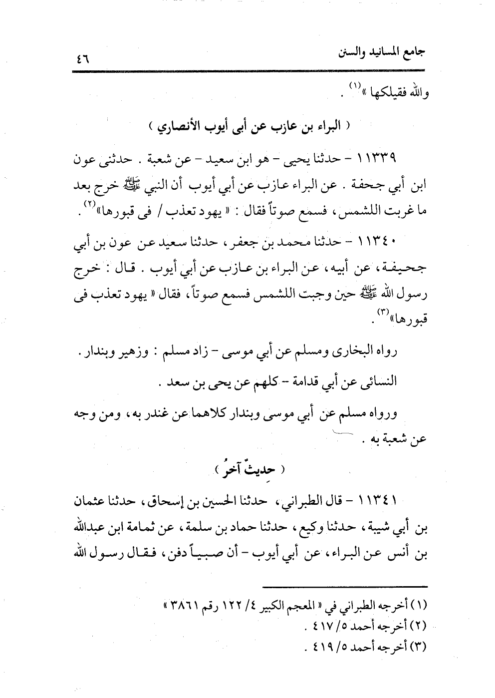 11340 - حدثنا محمد بن جعفر، حدثنا سعيد عن عون بن أبى جحيفة، عن أبيه، عن البراء بن عازب عن أبى أيوب، قال: خرج رسول الله - صلى الله عليه وسلم - حين وجبت الشمس فسمع صوتًا، فقال «يهود تعذب فى قبورها» (¬2) .