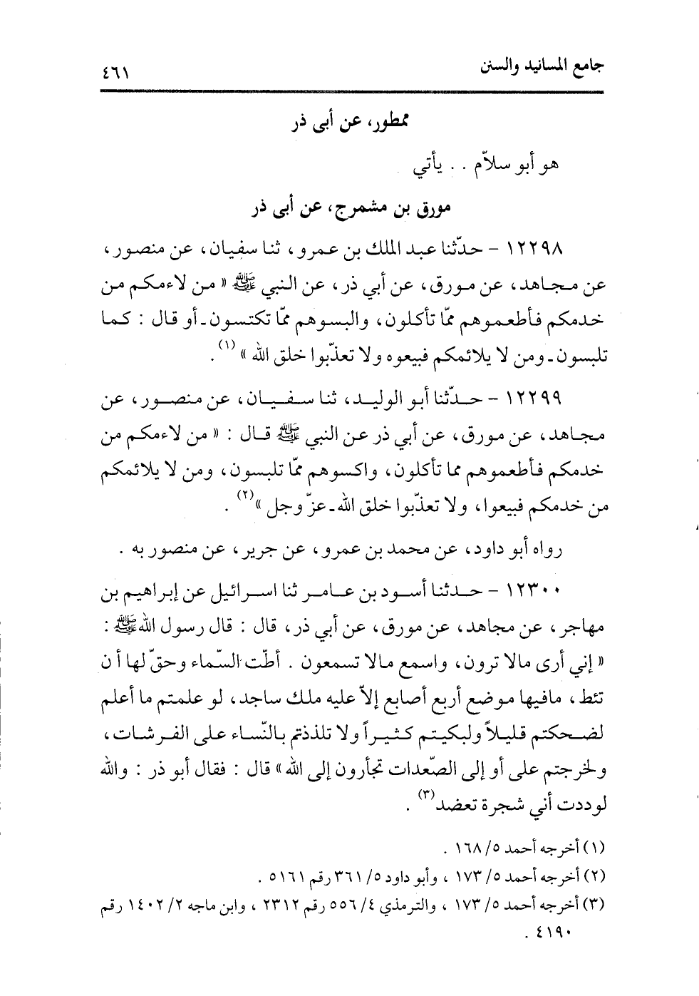 12299 - حدثنا أبو الوليد، ثنا سفيان، عن منصور، عن مجاهد، عن مورق، عن أبى ذر عن النبى - صلى الله عليه وسلم - قال: «من لاءمكم من خدمكم فأطعموهم مما تأكلون، واكسوهم مما تلبسون، ومن لا يلائمكم من خدمكم فبيعوا، ولا تعذبوا خلق الله ـ عز وجل» (¬2) .