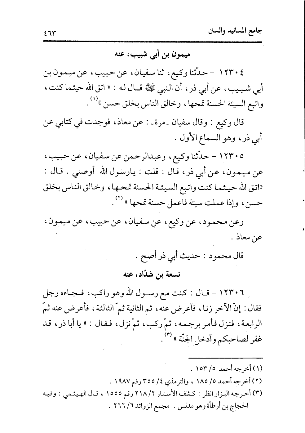 12304 - حدثنا وكيع، ثنا سفيان، عن حبيب، عن ميمون بن أبى شبيب، عن أبى ذر، أن النبى - صلى الله عليه وسلم - قال له: «اتق الله حيثما كنت، واتبع السيئة الحسنة تمحها، وخالق الناس بخلق حسن» (¬1) .