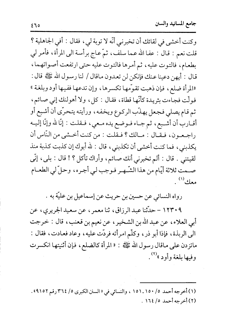12309 - حدثنا عبد الرزاق، ثنا معمر، عن سعيد الجريرى، عن أبى العلاء، عن عبد الله بن الشخير، عن نعيم بن قعنب، قال: خرجت إلى الربذة، فإذا أبو ذر، وكلم امرأته فردت عليه، وعاد فعادت، فقال: ما تزدن على ما قال رسول الله - صلى الله عليه وسلم -: «المرأة كالضلع، فإن أثنيتها انكسرت وفيها بلغة وأورد» (¬1) .