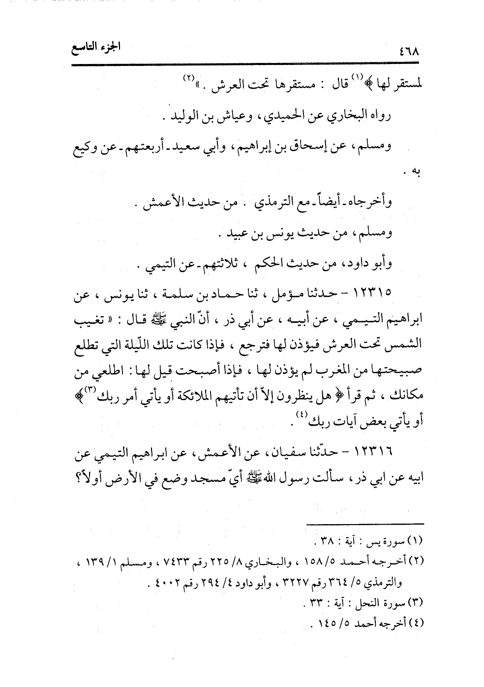 12315 - حدثنا مؤمل، ثنا حماد بن سلمة، ثنا يونس، عن إبراهيم التيمى، عن أبيه، عن أبى ذر، أن النبى - صلى الله عليه وسلم - قال: «تغيب الشمس تحت العرش فيؤذن لها فترجع، فإذا كانت تلك الليلة التى تطلع صبيحتها من المغرب لم يؤذن لها، فإذا أصبحت قيل لها: اطلعى من مكانك، ثم قرأ {هَلْ يَنْظُرُونَ إِلَّا أَنْ تَأْتِيَهُمُ الْمَلائِكَةُ أَوْ يَأْتِيَ أَمْرُ رَبِّك} (¬1) أو يأتى بعض آيات ربك (¬2) .
