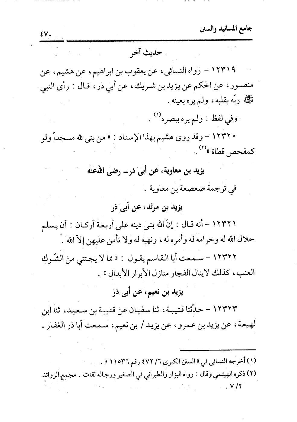 12323 - حدثنا قتيبة، ثنا سفيان عن قتيبة بن سعيد، ثنا ابن لهيعة، عن يزيد بن عمرو، عن يزيد/ بن نعيم، سمعت أبا ذر الغفار ـ