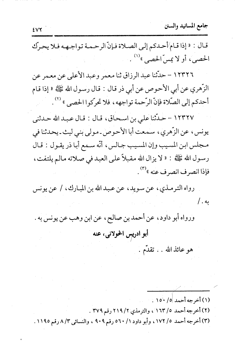 12326 - حدثنا عبد الرزاق ثنا معمر وعبد الأعلى عن معمر عن الزهرى عن أبى الأحوص عن أبى ذر قال: قال رسول الله - صلى الله عليه وسلم - «إذا قام أحدكم إلى الصلاة فإن الرحمة تواجهه، فلا تحركوا الحصى» (¬1) .