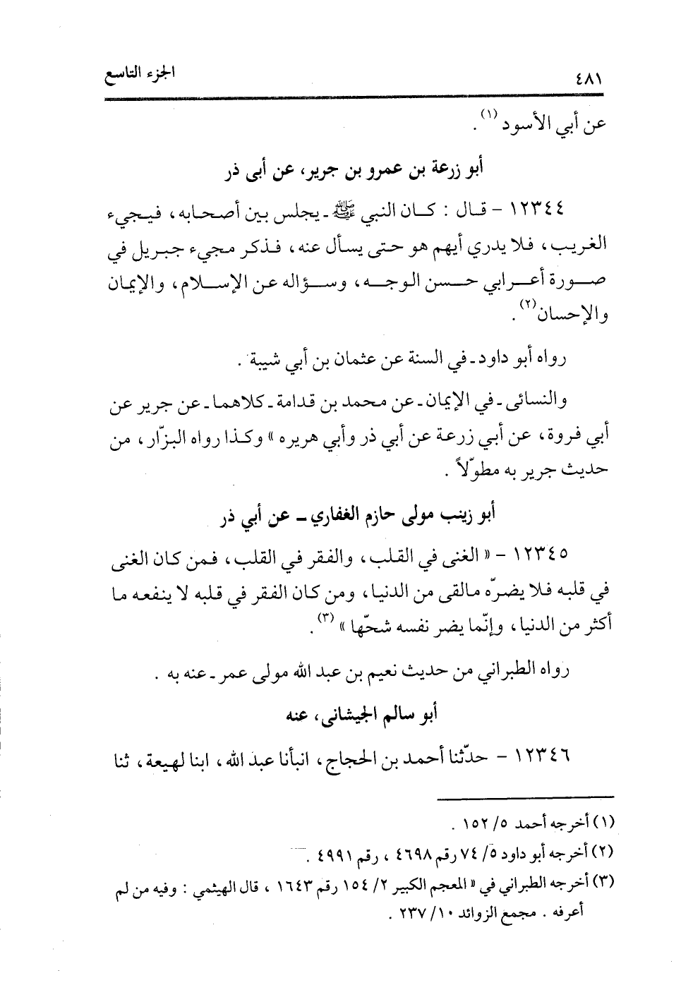 12344 - قال: كان النبى - صلى الله عليه وسلم - يجلس بين أصحابه، فيجئ الغريب، فلا يدرى أيهم هو حتى يسأل عنه، فذكر مجئ جبريل فى صورة أعرابى حسن الوجه، وسؤاله عن الإسلام، والإيمان والإحسان (¬1) .