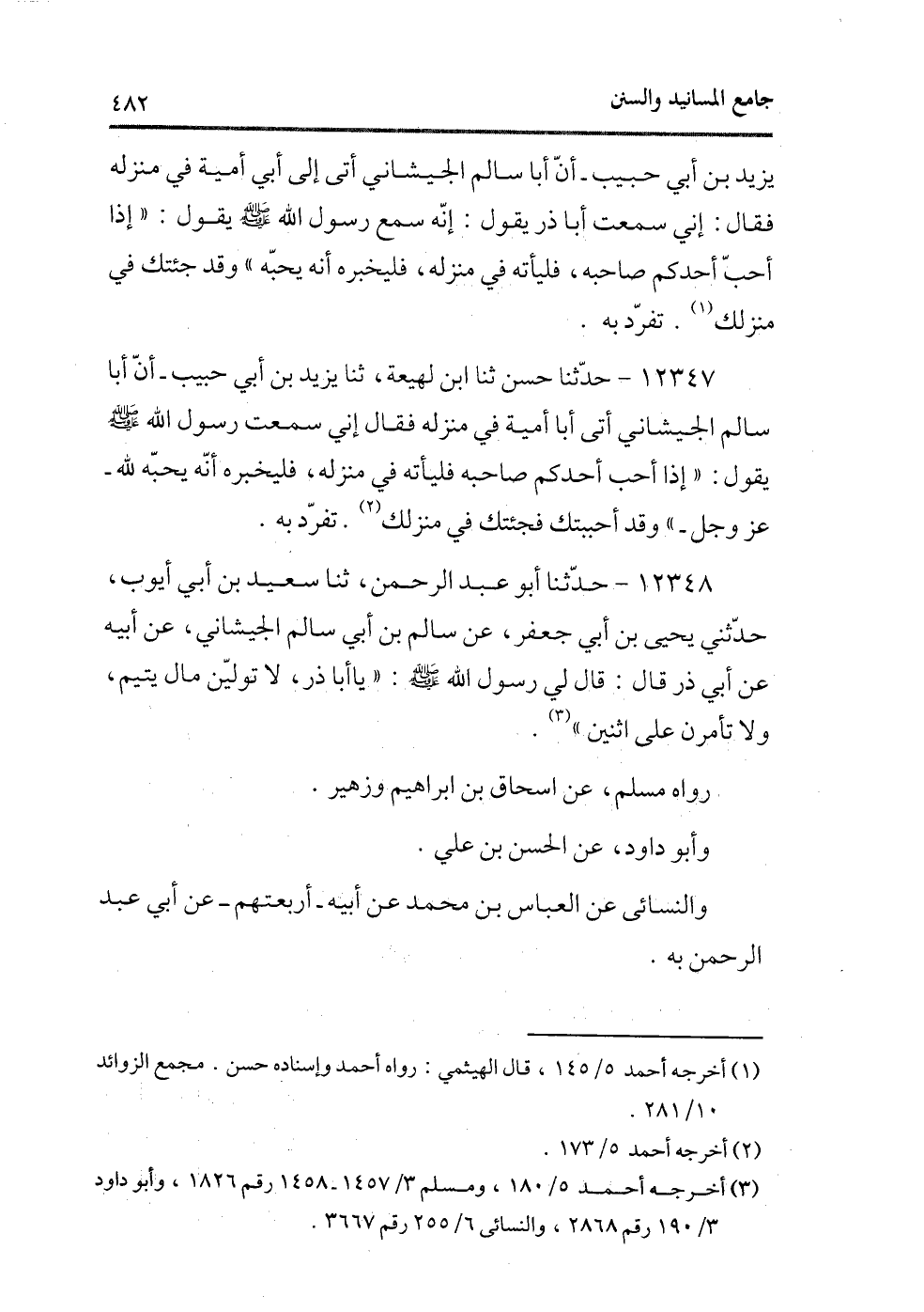 يزيد بن أبى حبيب ـ أن أبا سالم الجيشانى أتى إلى أبى أمية فى منزله فقال: إنى سمعت أبا ذر يقول: إنه سمع رسول الله - صلى الله عليه وسلم - يقول: «إذا أحب أحدكم صاحبه، فليأته فى منزله، فليخبره أنه يحبه» وقد جئتك فى منزلك (¬1) . تفرد به.