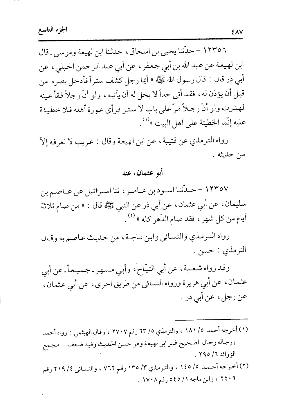 12356 - حدثنا يحيى بن إسحاق، حدثنا ابن لهيعة وموسى ـ قال ابن لهيعة عن عبد الله بن أبى جعفر، عن أبى عبد الرحمن الحبلى، عن أبى ذر قال: قال رسول الله - صلى الله عليه وسلم - «أيما رجل كشف سترًا فأدخل بصره من قبل أن يؤذن له، فقد أتى حدًا لا يحل له أن يأتيه، ولو أن رجلاً فقأ عينه لهدرت ولو أن رجلاً مر على باب لا ستر فرأى عورة أهله فلا خطيئة عليه إنما الخطيئة على أهل البيت» (¬1) .