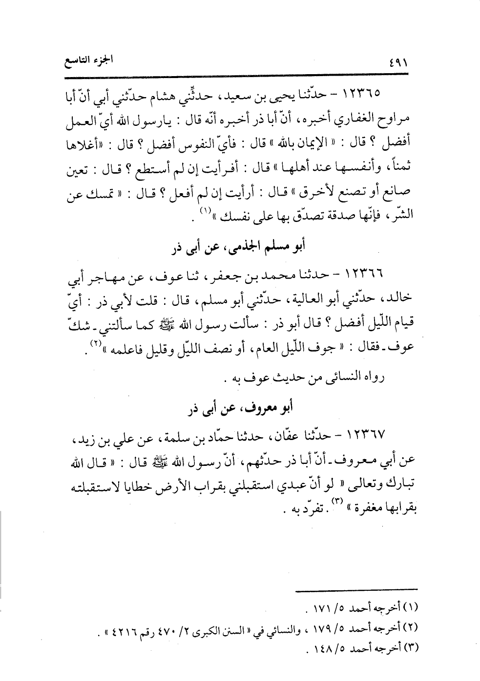 12365 - حدثنا يحيى بن سعيد، حدثنى هشام حدثنى أبى أن أبا مراوح الغفارى أخبره، أن أبا ذر أخبره أنه قال: يا رسول الله أى العمل أفضل؟ قال: «الإيمان بالله» قال: فأى النفوس أفضل؟ قال: «أغلاها ثمنًا، وأنفسها عند أهلها» قال: أفرأيت إن لم أستطع؟ قال: «تعين صانع أو تصنع لأخرق» قال: أرأيت إن لم أفعل؟ قال: «تمسك عن الشر، فإنها صدقة تصدق بها على نفسك» (¬1) .