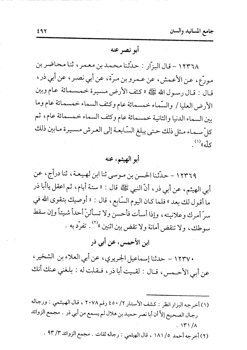 (¬1) أخرجه البزار انظر: كشف الأستار 2/450 رقم2078، قال الهيثمى: ورجاله رجال الصحيح إلا أن أبا نصر حميد بن هلال لم يسمع من ابى ذر. مجمع الزوائد 8/131.
