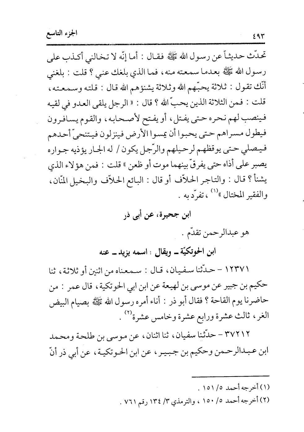 12372 - حدثنا سفيان، ثنا اثنان، عن موسى بن طلحة ومحمد بن عبد الرحمن وحكيم بن جبير، عن ابن الحوتكية، عن أبى ذر أن