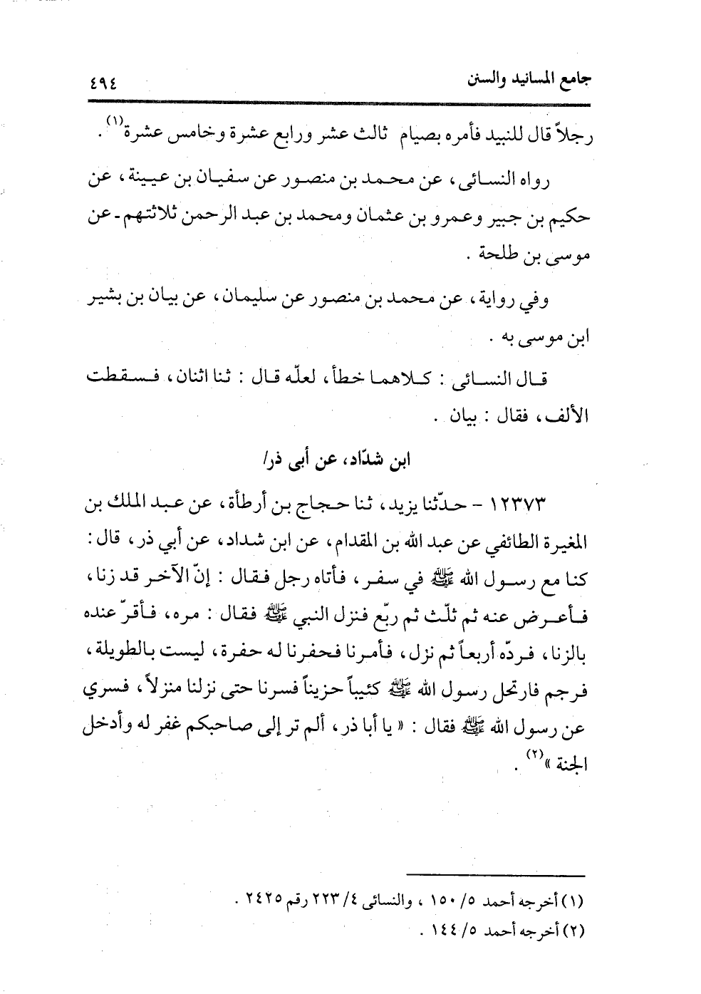 12373 - حدثنا يزيد، ثنا حجاج بن أرطأة، عن عبد الملك بن المغيرة الطائفى عن عبد الله بن المقدام، عن ابن شداد، عن أبى ذر، قال: كنا مع رسول الله - صلى الله عليه وسلم - فى سفر، فأتاه رجل فقال: إن الآخر قد زنا، فأعرض عنه ثم ثلث ثم ربع فنزل النبى - صلى الله عليه وسلم - فقال: «مره» ، فأقر عنده بالزنا، فرده أربعًا ثم نزل، فأمرنا فحفرنا له حفرة، ليست بالطويلة، فرجم فارتحل رسول الله - صلى الله عليه وسلم - كئيبًا حزينًا فسرنا حتى نزلنا منزلاً، فسرى عن رسول الله - صلى الله عليه وسلم - فقال: «يا أبا ذر، ألم تر إلى صاحبك غفر له وأدخل الجنة» (¬1) .