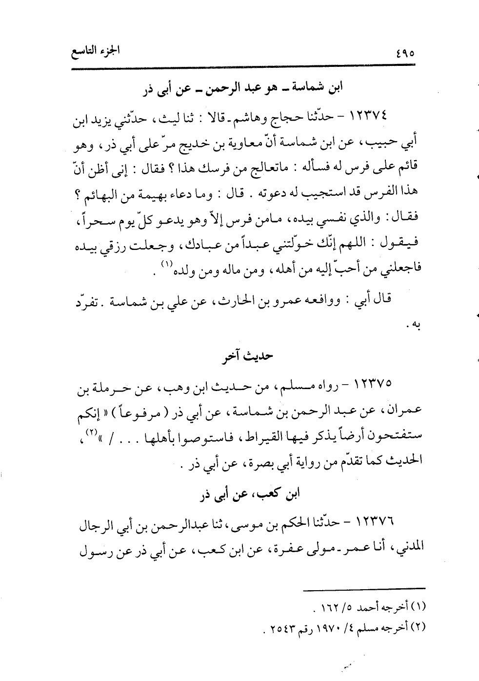 12374 - حدثنا حجاج وهاشم ـ قالا: ثنا ليث، حدثنى يزيد بن أبى حبيب، عن ابن شماسة أن معاوية بن خديج مر على أبى ذرن وهو قائم على فرس له فسأله: ما تعالج من فرسك هذا؟ فقال: إنى أظن أن هذا الفرس قد استجيب له دعوته. قال: وما دعاء بهيمة من البهائم؟ فقال: والذى نفسى بيده، ما من فرس إلا وهو يدعو كل يوم سحرًا، فيقول: اللهم إنك خولتنى عبدًا من عبادك، وجعلت رزقى بيده فاجعلنى من أحب إليه من أهله، ومن ماله ومن ولده (¬1) .