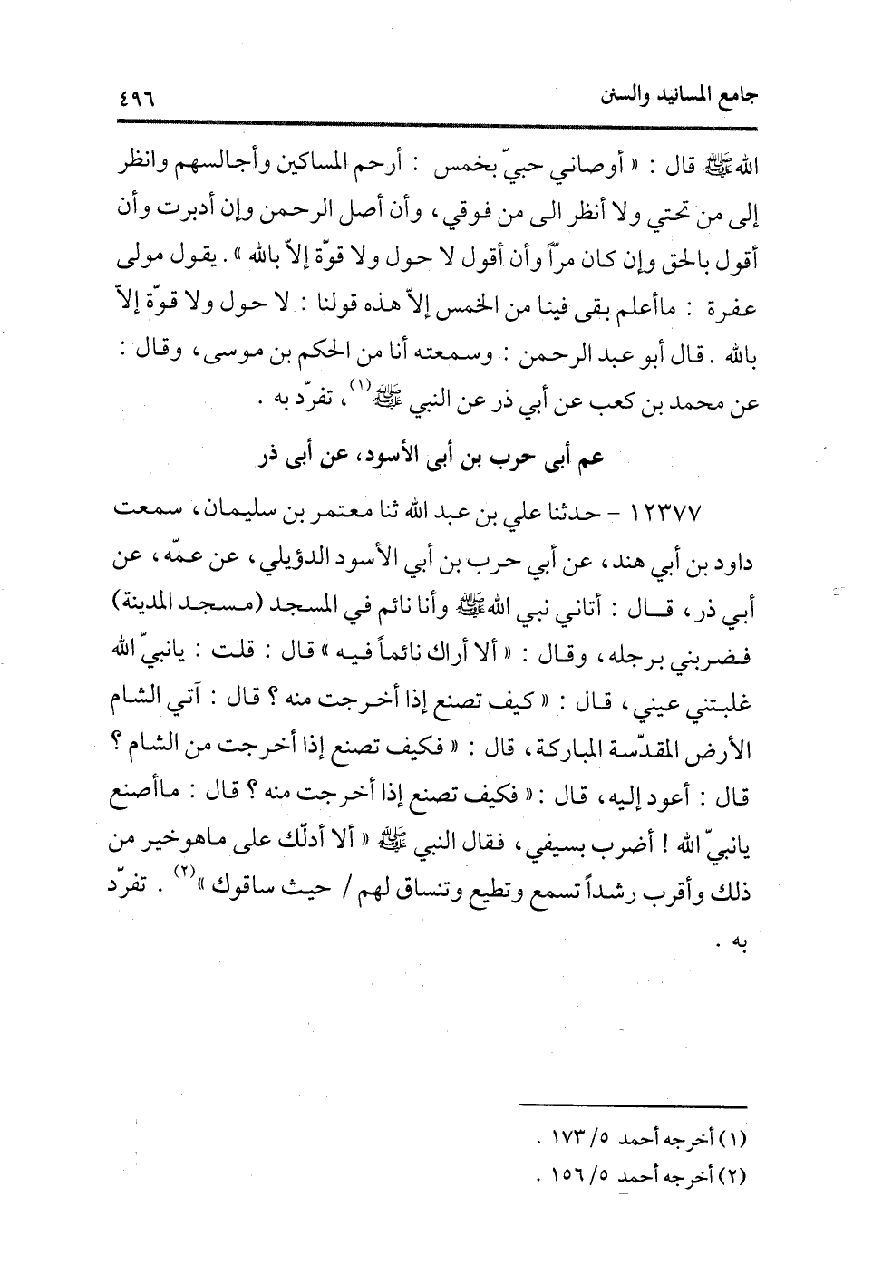 12377 - حدثنا علي بن عبد الله ثنا معتمر بن سليمان، سمعت داود بن أبى هند، عن أبى حرب بن أبى الأسود الدؤيلى، عن عمه، عن أبى ذر، قال: أتانى نبى الله - صلى الله عليه وسلم - وأنا نائم فى المسجد (مسجد المدينة) فضربنى برجله، وقال: «ألا أراك نائمًا فيه» قال: قلت: يا نبى الله غلبتنى عينى، قال: «كيف تصنع إذا أخرجت منه؟» قال: آتى الشام الأرض المقدسة المباركة، قال: «فكيف تصنع إذا أخرجت من الشام؟» قال: أعود إليه، قال: «فكيف تصنع إذا أخرجت منه؟» قال: ما أصنع يا نبى اللهأضرب بسيفى، فقال النبى - صلى الله عليه وسلم - «ألا أدلك على ما هو خير من ذلك وأقرب رشدًا تسمع وتطيع وتنساق لهم/ حيث ساقوك» (¬1) . تفرد به.