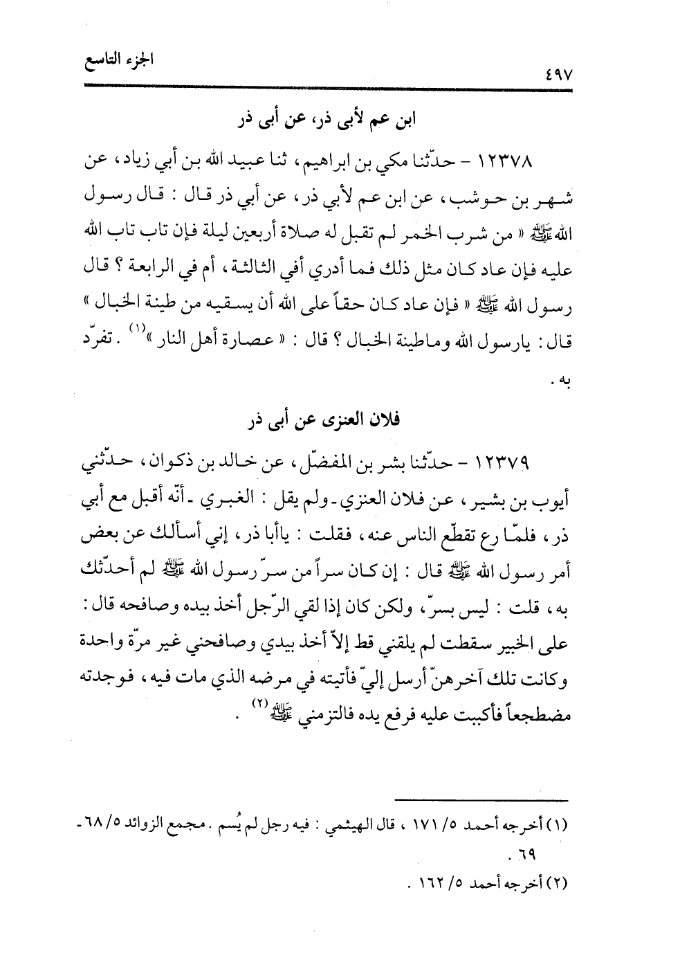 12379 - حدثنا بشر بن المفضل، عن خالد بن ذكوان، حدثنى أيوب بن بشير، عن فلان العنزى ـ ولم يقل: الغبرى ـ أنه أقبل مع أبى ذر، فلما رع تقطع الناس عنه، فقلت: يا أبا ذر، إنى أسألك عن بعض أمر رسول الله - صلى الله عليه وسلم - قال: إن كان سرًا من سر رسول الله - صلى الله عليه وسلم - لم أحدثك به، قلت: ليس بسر، ولكن كان إذا لقى الرجل أخذ بيده وصافحه قال: على الخبير سقطت لم يلقنى قط إلا أخذ بيدى وصافحنى غير مرة واحدة وكانت تلك آخرهن أرسل إليّ فأتيته فى مرضه الذى مات فيه، فوجدته مضطجعًا فأكببت عليه فرفع يده فالتزمنى - صلى الله عليه وسلم - (¬2) .