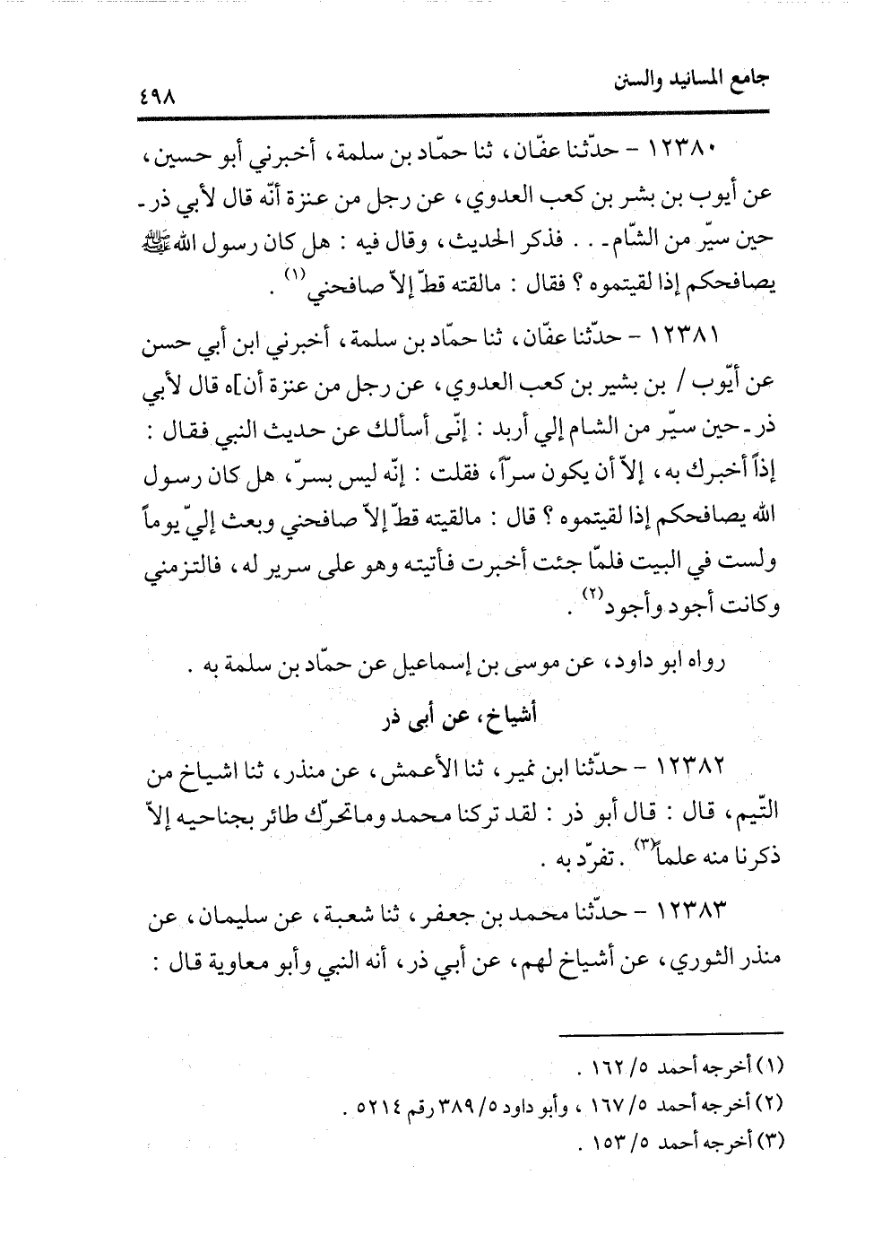12381 - حدثنا عفان، ثنا حماد بن سلمة، أخبرنى ابن أبى حسن عن أيوب/ بن بشير بن كعب العدوى، عن رجل من عنزة أنه قال لأبى ذر ـ حين سير من الشام إلى أربد: إنى أسألك عن حديث النبى فقال: إذًا أخبرك به، إلا أن يكون سرًا، فقلت: إنه ليس بسر، هل كان رسول الله يصافحكم إذا لقيتموه؟ قال: ما لقيته قط إلا صافحنى وبعث إليّ يومًا ولست فى البيت فلما جئت أخبرت فأتيته وهو على سرير له، فالتزمنى وكانت أجود وأجود (¬2) .