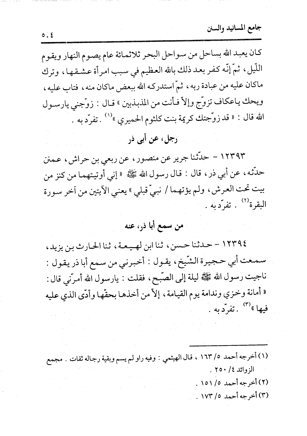 12394 - حدثنا حسن، ثنا ابن لهيعة، ثنا الحارث بن يزيد، سمعت أبى حجيرة الشيخ، يقول: أخبرنى من سمع أبا ذر يقول: ناجيت رسول الله - صلى الله عليه وسلم - ليلة إلى الصبح، فقلت: يا رسول الله أمرنى قال: «أمانة وخزى وندامة يوم القيامة، إلا من أخذها بحقها وأدى الذى عليه فيها» (¬2) . تفرد به.