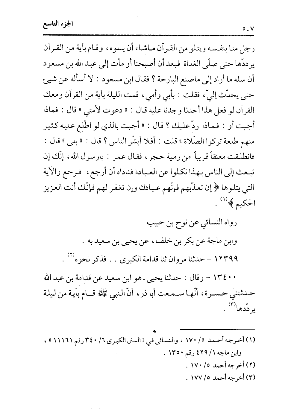 رجل منا بنفسه ويتلو من القرآن ما شاء أن يتلوه، وقام بآية من القرآن يرددها حتى صلى الغداة فبعد أن أصبحنا أومأت إلى عبد الله بن مسعود أن سله ما أراد إلى ما صنع البارحة؟ فقال ابن مسعود: لا أسأله عن شئ حتى يحدث إليّ، فقلت: بأبى وأمى، قمت الليلة بآية من القرآن ومعك القرآن لو فعل هذا أحدنا وجدنا عليه قال: «دعوت لأمتى» قال: فماذا أجبت أو: فماذا رد عليك؟ قال: «أجبت بالذى لو اطلع عليه كثير منهم طلعة تركوا الصلاة» قلت: أفلا أبشر الناس؟ قال: «بلى» قال: فانطلقت معنقًا قريبًا من رمية حجر، فقال عمر: يا رسول الله، إنك إن تبعث إلى الناس بهذا نكلوا عن العبادة فناداه أن أرجع، فرجع والآية التى يتلوها {إِنْ تُعَذِّبْهُمْ فَإِنَّهُمْ عِبَادُكَ وَإِنْ تَغْفِرْ لَهُمْ فَإِنَّكَ أَنْتَ الْعَزِيزُ الْحَكِيمُ} (¬1) .