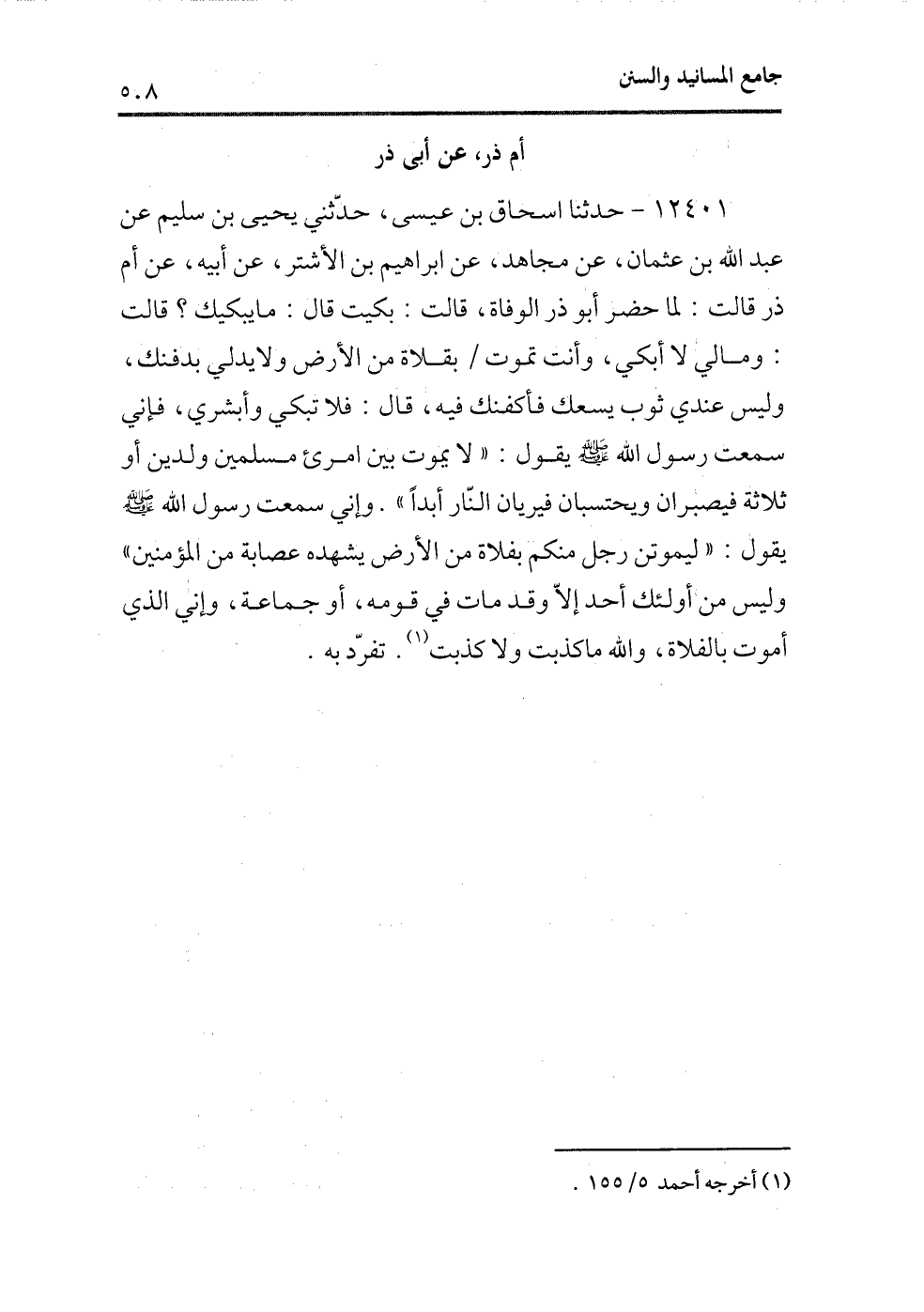 12401 - حدثنا إسحاق بن عيسى، حدثنى يحيى بن سليم عن عبد الله بن عثمان، عن مجاهد، عن إبراهيم بن الأشتر، عن أبيه، عن أم ذر قالت: لما حضر أبو ذر الوفاة، قالت: بكيت قال: ما يبكيك؟ قالت: وما لى لا أبكى، وأنت تموت/ بقلاة من الأرض ولا يدلى بدفنك، وليس عندى ثوب يسعك فأكفنك فيه، قال: فلا تبكى وأبشرى، فإنى سمعت رسول الله - صلى الله عليه وسلم - يقول: «لا يموت بين امرئ مسلمين ولدين أو ثلاثة فيصبران ويحتسبان فيريان النار أبدًا» . وإنى سمعت رسول الله - صلى الله عليه وسلم - يقول: «ليموتن رجل منك بفلاة من الأرض يشهده عصابة من المؤمنين» وليس من أولئك أحد إلا وقد مات فى قومه، أو جماعة، وإنى الذى أموت بالفلاة، والله ما كذبت ولا كذبت (¬1) . تفرد به.