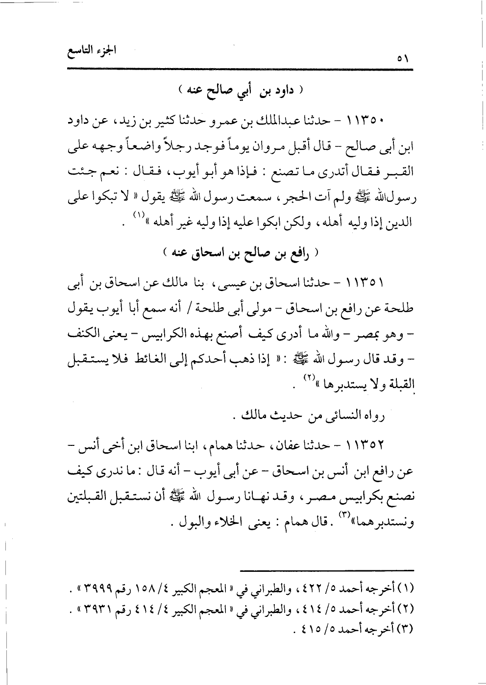 11352 - حدثنا عفان، حدثنا همام، ابنا إسحاق ابن أخى أنس ـ عن رافع ابن أنس بن إسحاق ـ عن أبى أيوب ـ أنه قال: ما ندرى كيف نصنع بكرابيس مصر، وقد نهانا رسول الله - صلى الله عليه وسلم - أن نستقبل القبلتين ونستدبرهما» (¬3) . قال همام: يعنى الخلاء والبول.