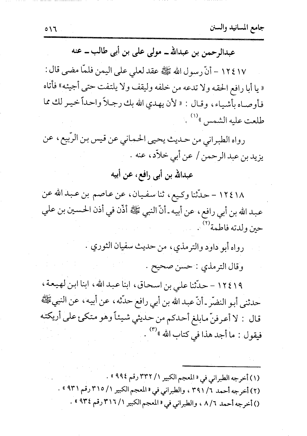 12417 - أن رسول الله - صلى الله عليه وسلم - عقد لعلي على اليمن فلما مضى قال: «يا أبا رافع الحقه ولا تدعه من خلفه وليقف ولا يلتفت حتى أجيئه» فأتاه فأوصاه بأشياء، وقال: «لأن يهدى الله بك رجلاً واحدًا خير لك مما طلعت عليه الشمس» (¬1) .