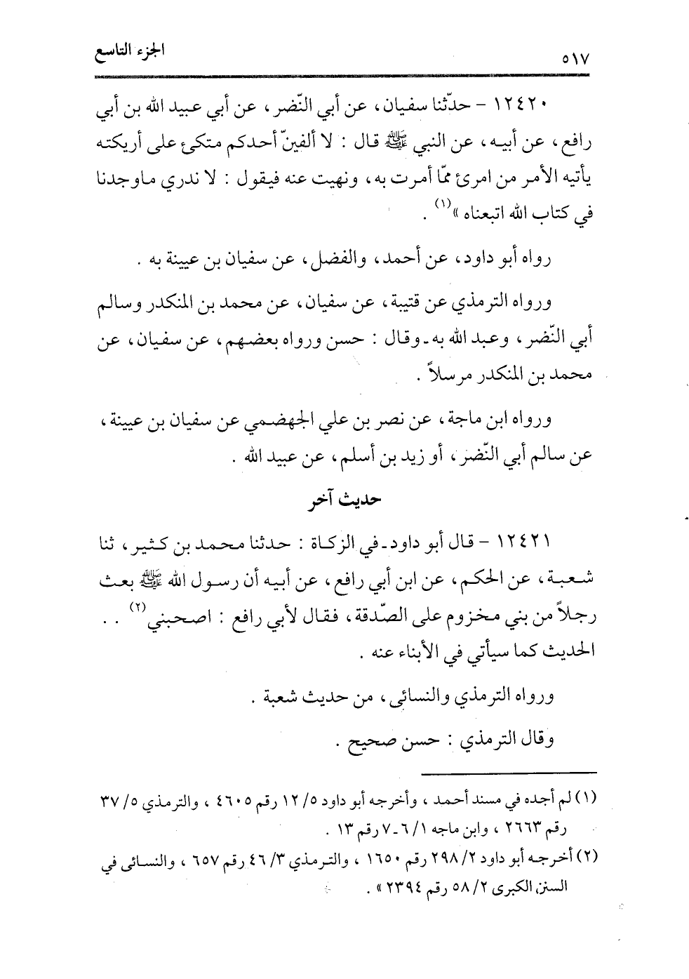 12420 - حدثنا سفيان، عن أبى النضر، عن أبى عبيد الله بن أبى رافع، عن أبيه، عن النبى - صلى الله عليه وسلم - قال: «لا ألفين أحدكم متكئ على أريكته يأتيه الأمر من أمرئ مما أمرت به، ونهيت عنه فيقول: لا ندرى ما وجدنا فى كتاب الله اتبعناه» (¬1) .