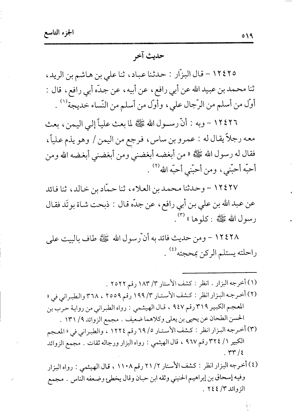 (¬3) أخرجه البزار انظر: كشف الأستار 5/69 رقم1224، والطبرانى فى «المعجم الكبير 1/324 رقم967، قال الهيثمى: رواه البزار ورجاله ثقات. مجمع الزوائد 4/33.