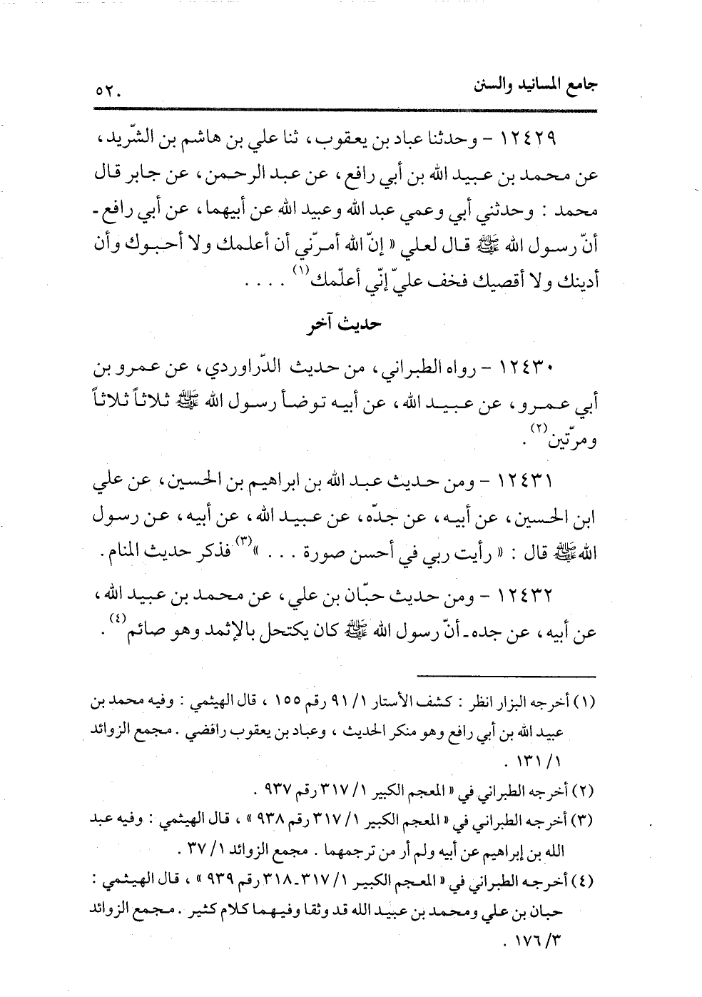 12431 - ومن حديث عبد الله بن إبراهيم بن الحسين، عن علي بن الحسين، عن أبيه، عن جده، عن عبيد الله، عن أبيه، عن رسول الله - صلى الله عليه وسلم - قال: «رأيت ربى فى أحسن صورة ... » (¬3) فذكر حديث المنام.