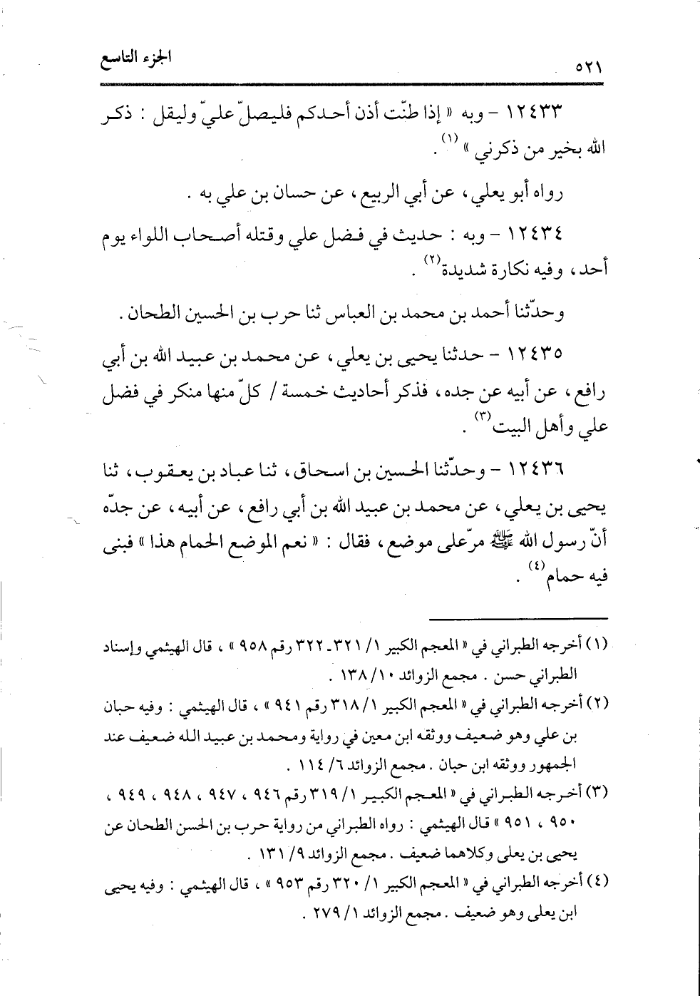 12436 - وحدثنا الحسين بن إسحاق، ثنا عباد بن يعقوب، ثنا يحيى بن يعلي، عن محمد بن عبيد الله بن أبى رافع، عن أبيه، عن جده أن رسول الله - صلى الله عليه وسلم - مر على موضع، فقال: «نعم الموضع الحمام هذا» فبنى فيه حمام (¬4) .