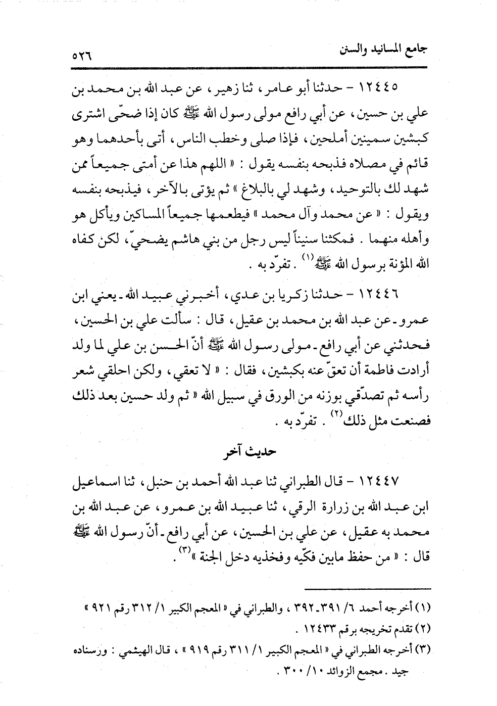 12445 - حدثنا أبو عامر، ثنا زهير، عن عبد الله بن محمد بن علي بن حسين، عن أبى رافع مولى رسول الله - صلى الله عليه وسلم - كان إذا ضحى اشترى كبشين سمينين أملحين، فإذا صلى وخطب الناس، أتى بأحدهما وهو قائم فى مصلاه فذبحه بنفسه يقول: «اللهم هذا عن أمتى جميعًا ممن شهد لك بالتوحيد، وشهد لى بالبلاغ» ثم يؤتى بالآخر، فيذبحه بنفسه ويقول: «عن محمد وآل محمد» فيطعمها جميعًا المساكين ويأكل هو وأهله منهما. فمكثنا سنينًا ليس رجل من بنى هاشم يضحى، لكن كفاه الله المؤنة برسول الله - صلى الله عليه وسلم - (¬1) . تفرد به.