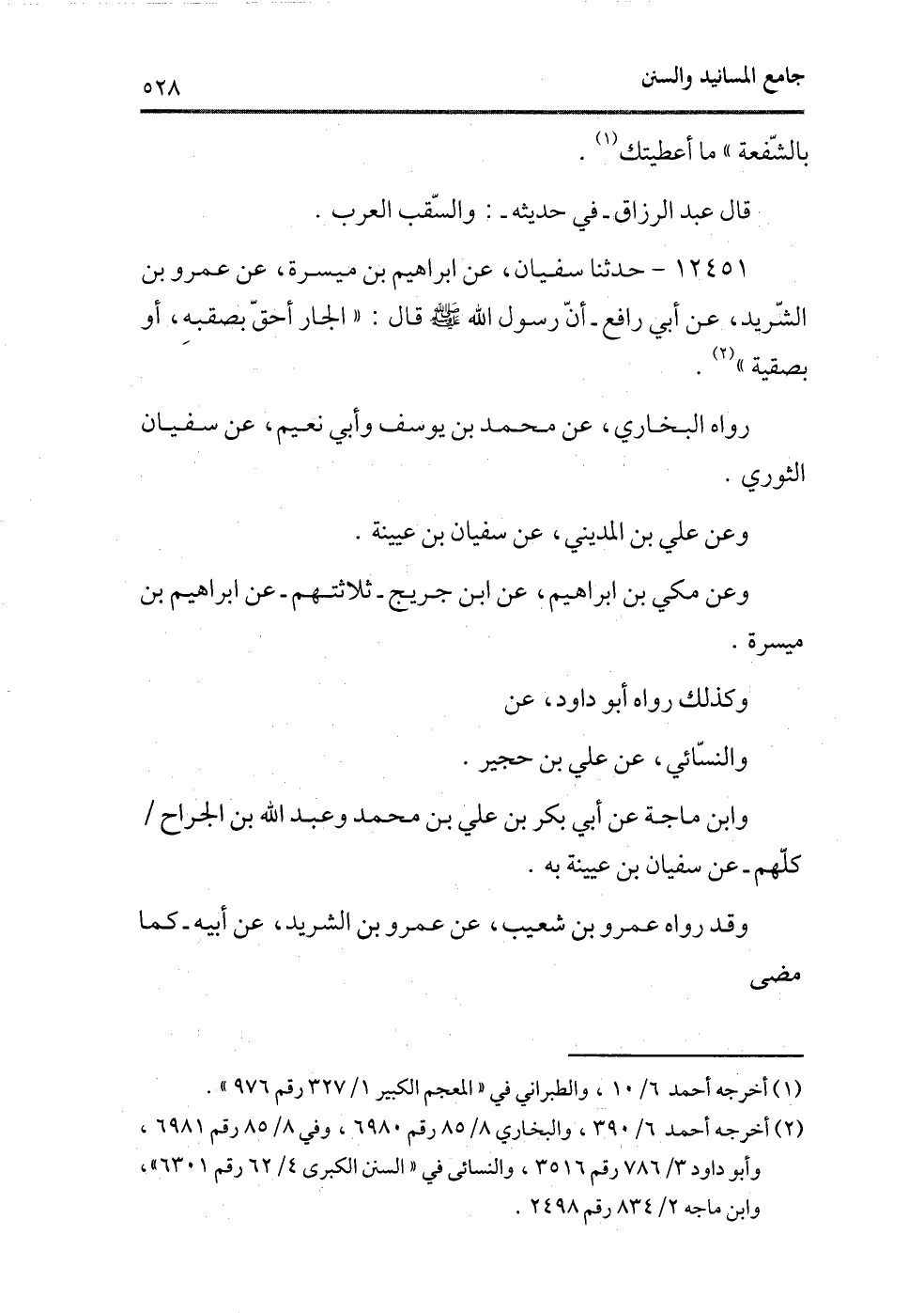 12451 - حدثنا سفيان، عن إبراهيم بن ميسرة، عن عمرو بن الشريد، عن أبى رافع ـ أن رسول الله - صلى الله عليه وسلم - قال: «الجار أحق بصقبه، أو بصقية» (¬1) .